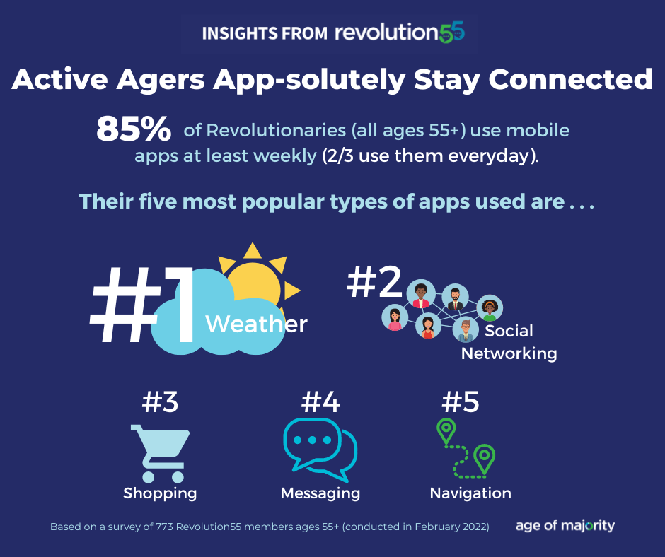 The source states how 85% of those aged in their mid 50s use apps in the USA alone, but added how it was mostly relating to the weather, over-ruling those for the benefit of social networking. This identified how such a campaign needed to shift this reputation and ensure that the Active Ageing-Consumers of the future, who will surely increase the networking apps greatly, are properly represented.