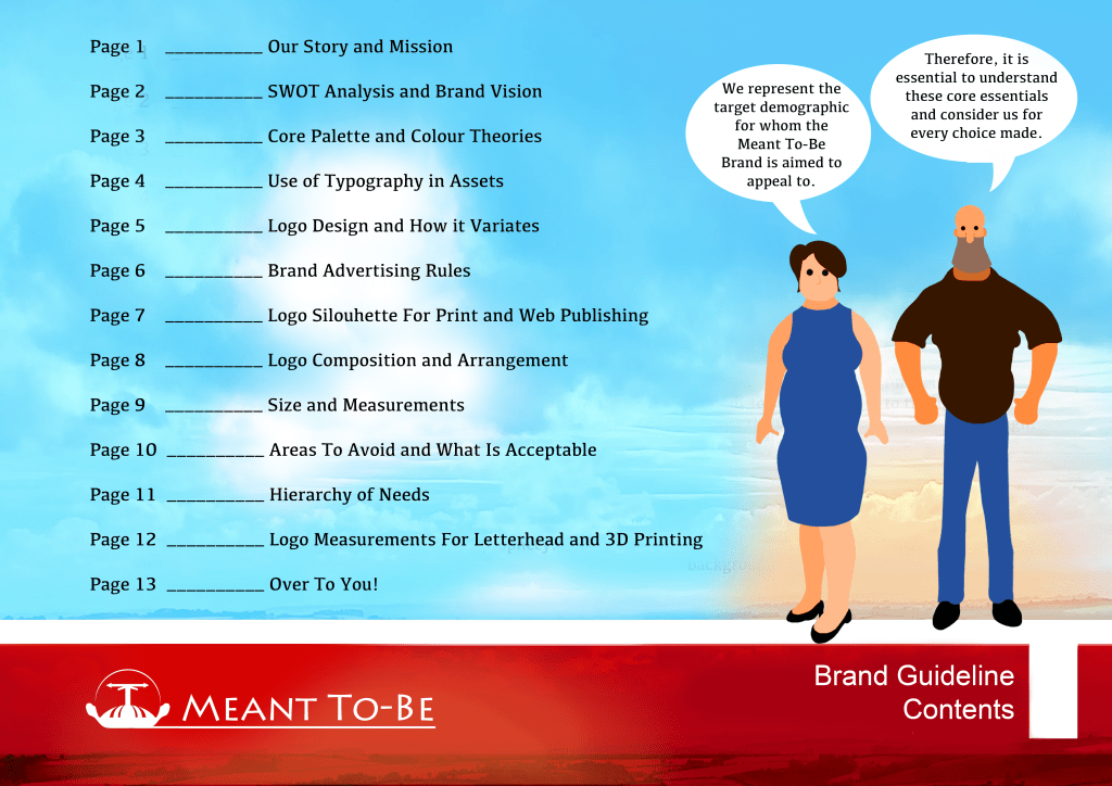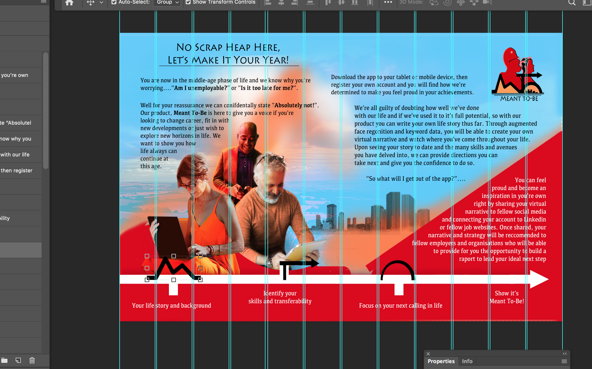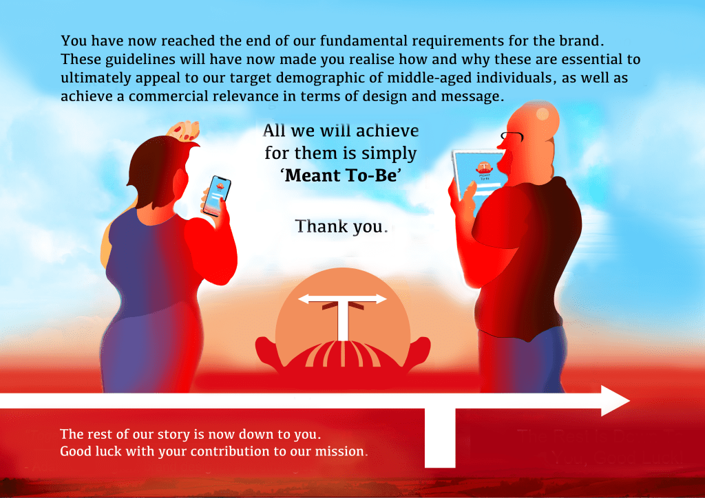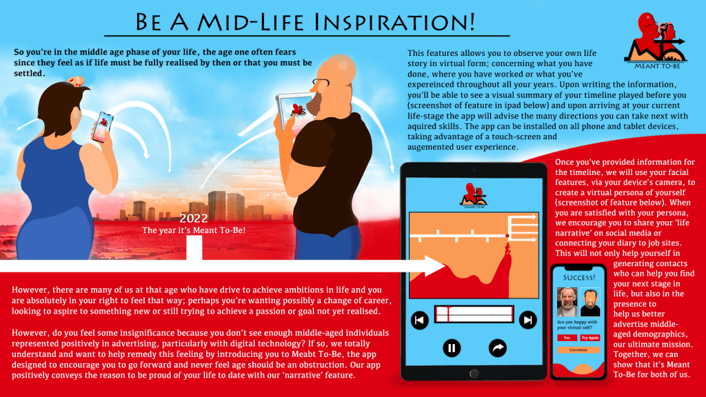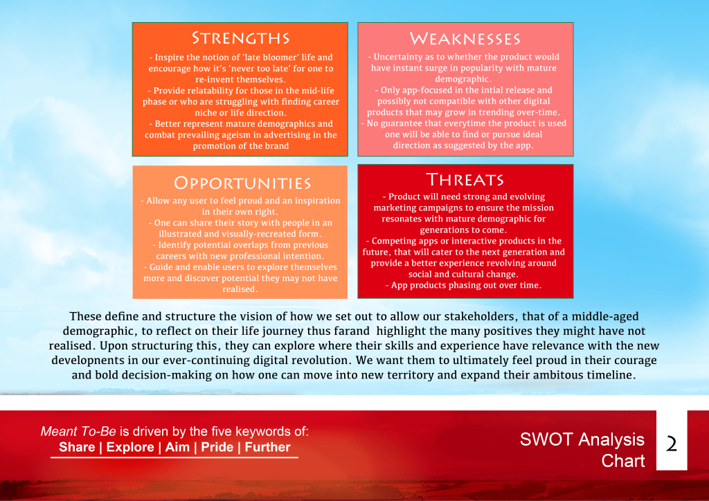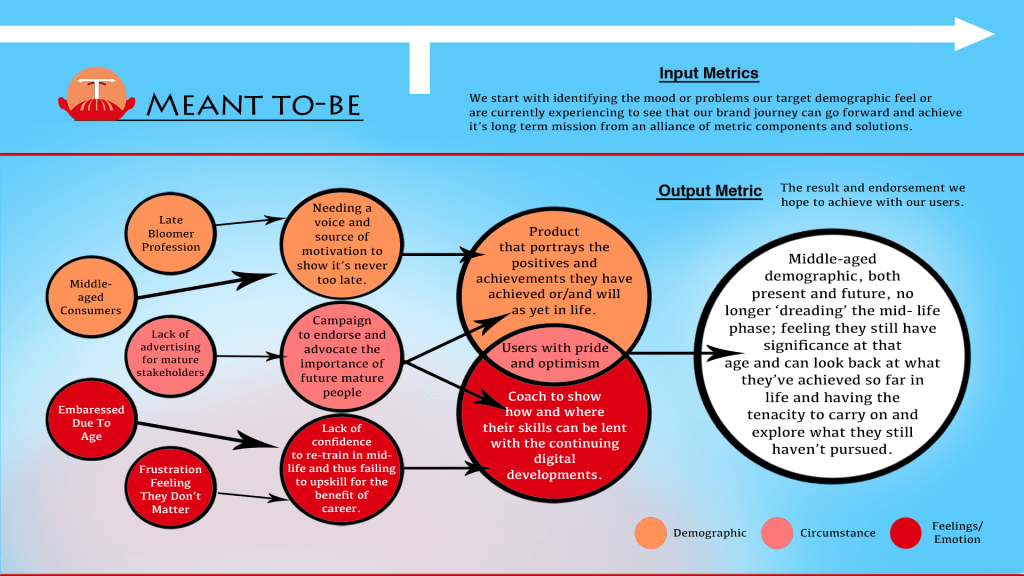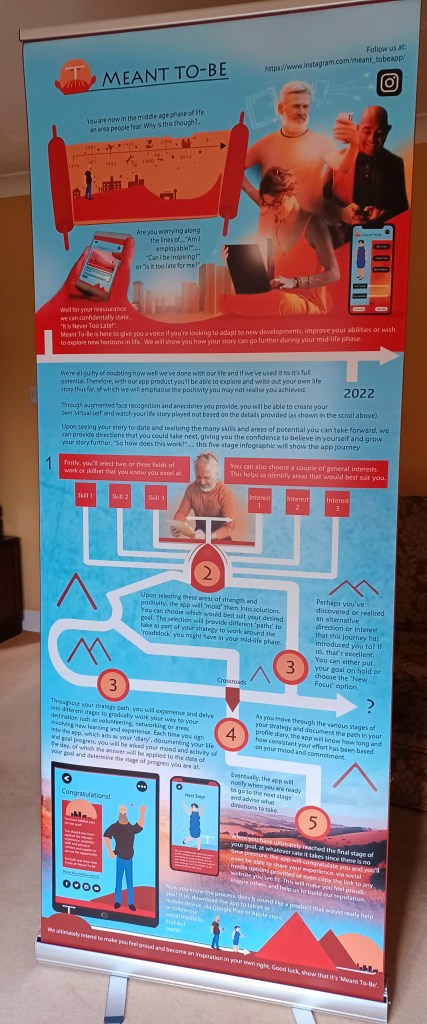 I also provided a SWOT analysis in the guideline to define the niche of Meant To-Be and the areas for one to consider that could strengthen, threaten or compromise its potential and competition. In addition, I produced two infographics; one provided an overview of the metrics instrumental in strategising the brand’s success and demonstrating its relevance. The second piece provided an insight as to how the app experience performs to the user, specifically the feature of strategising their goal and how they will progress through the five-stage journey. Seeing the potential to showcase my product at an investor’s pitch, I decided to invest in having my brand guidelines and the latter infographic printed professionally as a brochure and pull-up banner, thus fulfilling the employer feedback of demonstrating my work in print.