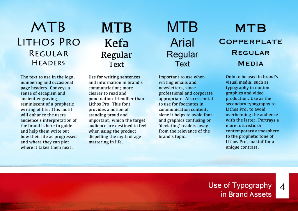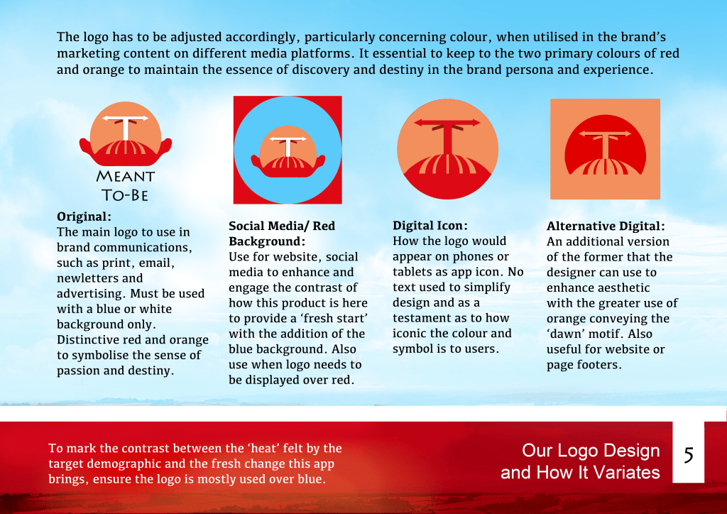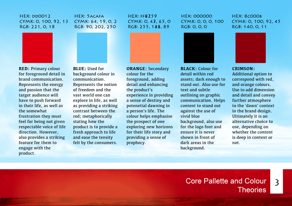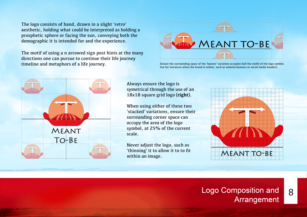 The final logo fulfilled my desired intentions; it conveys an optimistic tone and showcases my intention of subtly conveying the persona; the sphere, red hill and trailing orange paths provide the illusion of a middle-aged man’s face. I utilised this final logo in the creation of posters and the brand guidelines of my product, demonstrating the relevant typography, colour, composition, measurements and rules to follow to maintain the identity and consistency of the brand’s communication (Gallery 20).