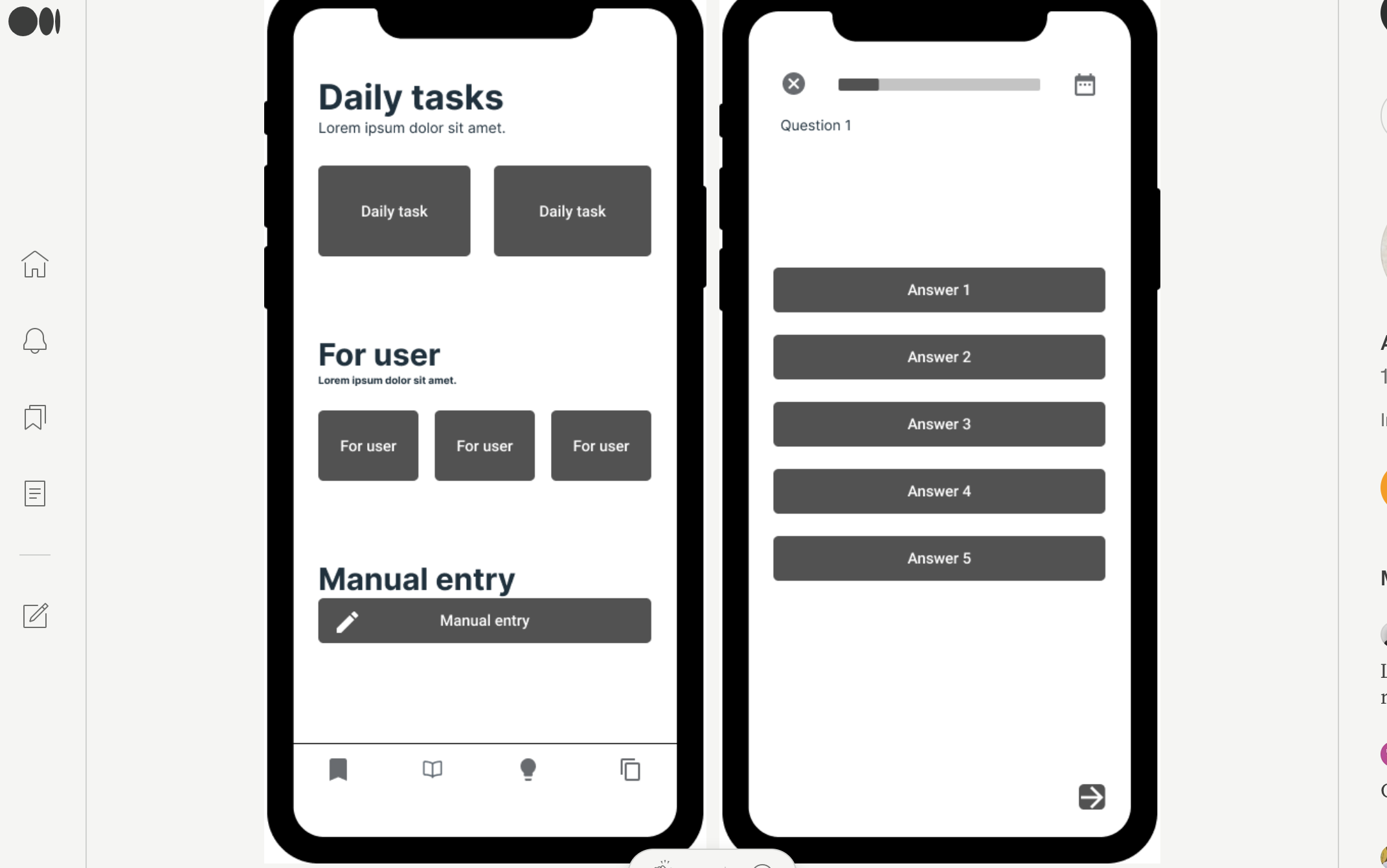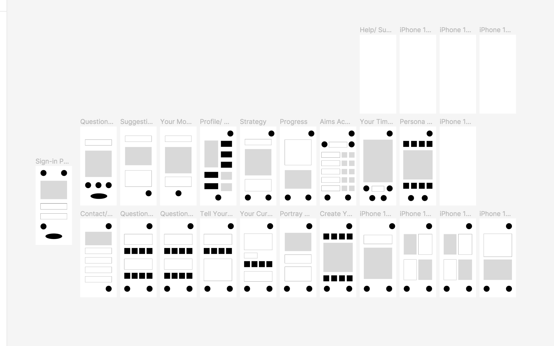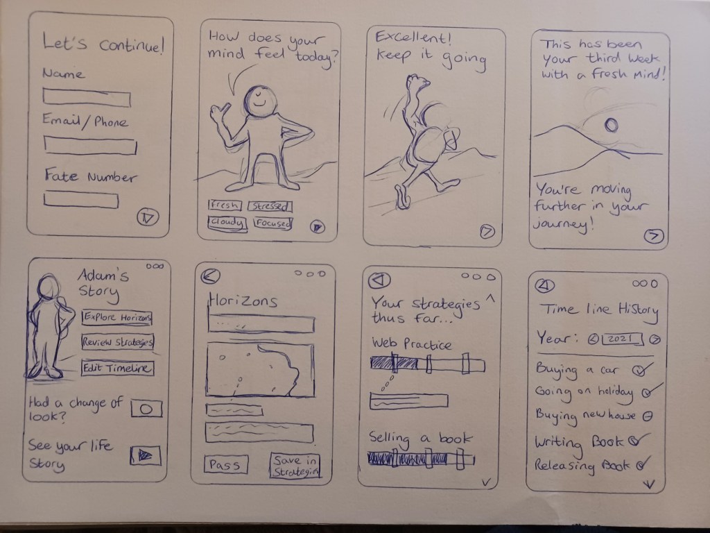 Following this research, I began to adapt the various drafts of the low-fidelity phase into a mid- fidelity that fleshed out the features that the app wold offer to help the user progress on their new direction. A further feature that I applied, keeping with the UX trend of visual data, was a ‘mood meter’ that would measure the user’s welfare based on the answers they give when they sign-in.