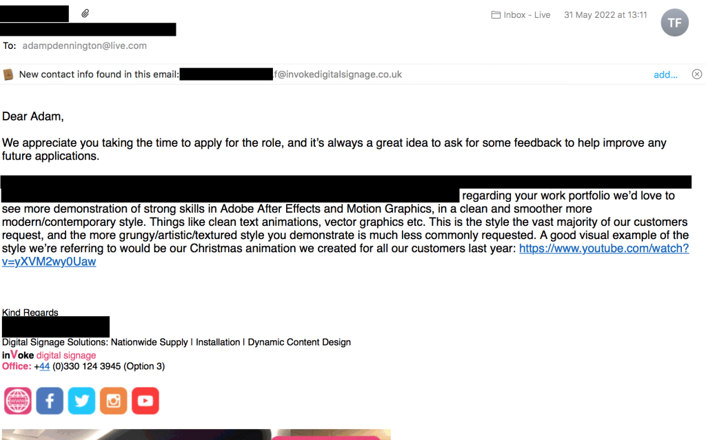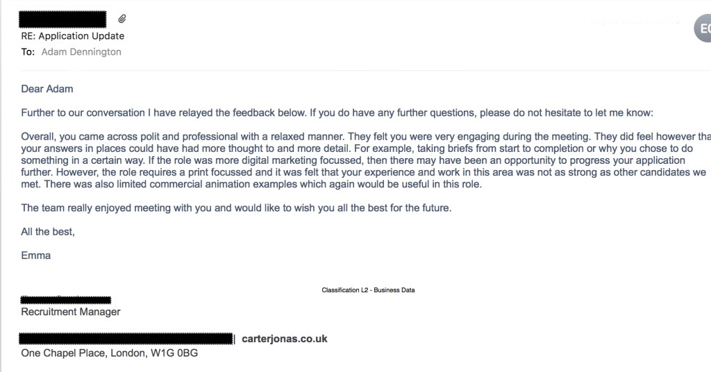 Two positions I applied for were at the companies of Carter Jonas and inVoke Digital Signage, who specialise in content for both print and the contemporary promotion of digital-screening. These companies ‘shaped’ my vision for how I should present the assets to promote my final project. The feedback from the companies mentioned how my portfolio content relied on an overabundance of texture and lacked a contemporary design and use of typography, often requested from their clientele (Gallery 1), as well as requiring examples of print work. I therefore made the decision to mirror a corporate approach and showcase print work, ensuring I would be worthy of such companies’ recruitment.