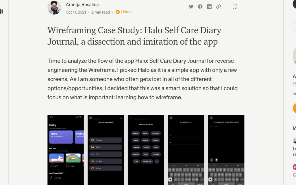 Rosalina, A, Wireframing Case Study: Halo Self Care Diary Journal, a dissection and imitation of the app, Medium.com.