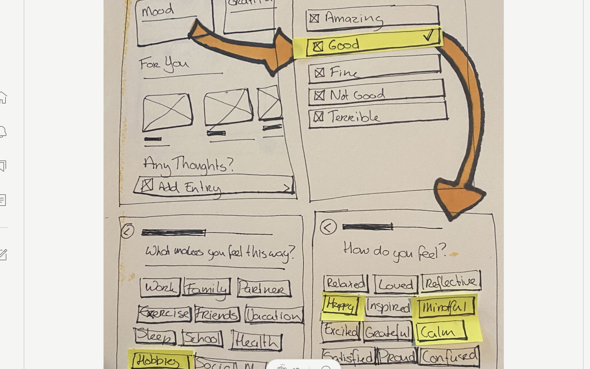 I drafted low-fidelity stages for my brand’s app, reflecting on the considerations collected from the aforementioned competitors. I defined my product as a hybrid of a diary and life coach, which made me realise how a page that strategised a goal for the user was essential, as well as that of a page to show one their life-story or to document their moments of positivity. In addition I remembered how it helps to have a Standard-Transitional Diagram to break down the product from beginning to end (Buxton, 2007, page 254).
