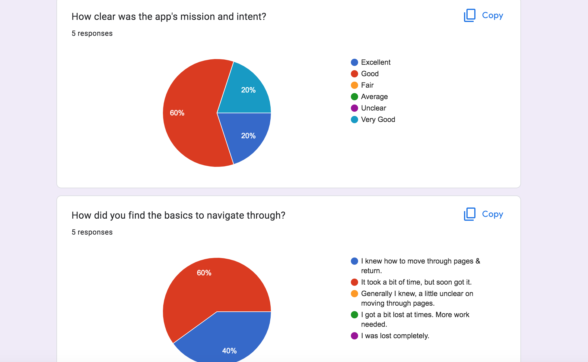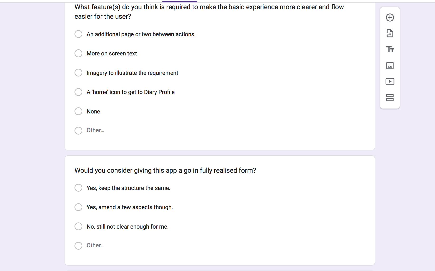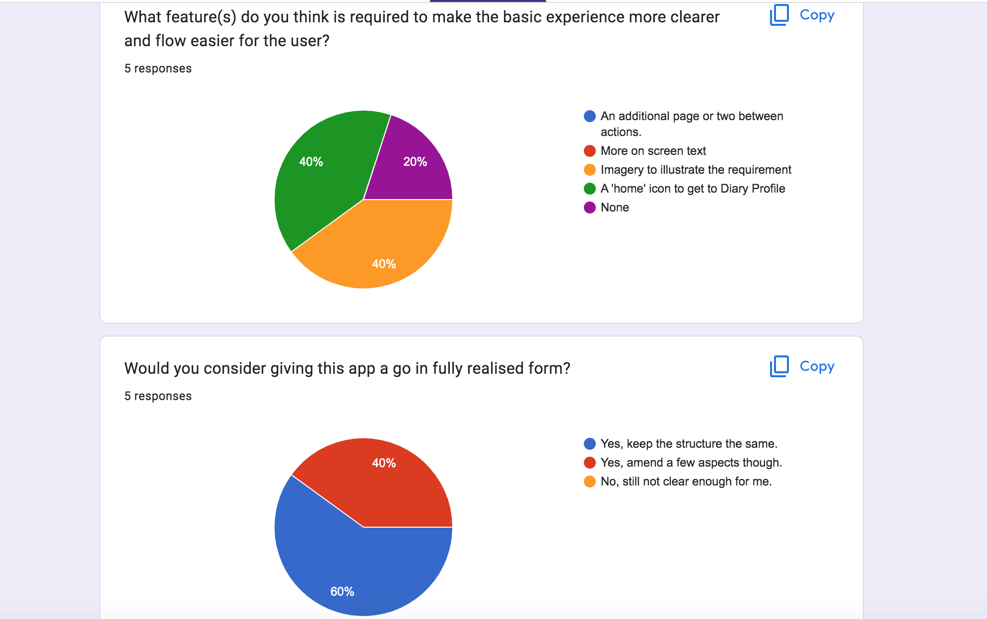 A more polarised response came in the form of how the experience could be clearer; 40% stating a home screen icon would be essential since it was hard to return to the diary profile screen, while another 40% stated imagery would help identity the pages clearer. However, on a whole I was certain that the experience was appealing enough considering how the majority understood how the app functioned and ranked it on a scale 8 out of 10.