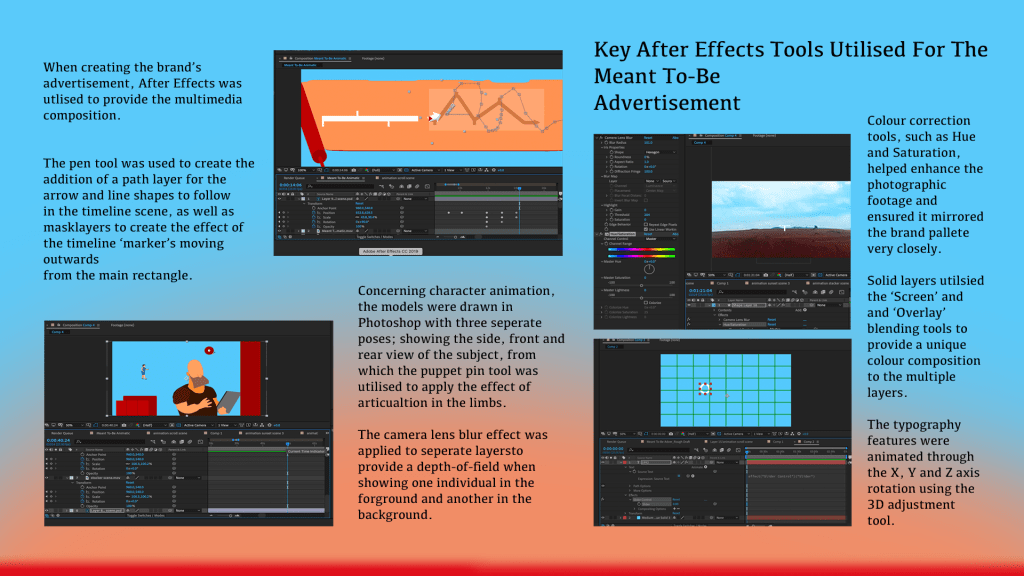 The advert would instead address the brand mission on a subject that could reflect a person or situation on a relatable level. The context would showcase the target demographic through subjects that could be interpreted as the target consumers, yet make no reference to age and allow for interpretation to recognise who the product would benefit predominantly. I used After Effects to compose the various multimedia assets for the advert and utilised various techniques to blend the various sources together.