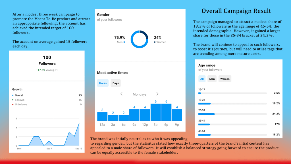 However, since my product was currently functioning as a micro or small brand, I was intent to strategise my campaign on a personal level. Therefore Facebook was the initial intention, but a conscious decision was made that the product could not be entirely focused on the range of 45- 60 year olds in 2022. It also needed to apply an additional method to gradually ‘traffic’ in the succeeding millennial generation, who are the catalyst to ensure sustainability in the brand. Therefore, I set up an Instagram account to experiment and test the appeal with the strategy to promote the brand over a three-week period, intending to attract around 100 followers. The product had initially been neutral regarding the gender I was targeting, so the Instagram campaign would be utilised as an experiment to determine who it appeals to the most regarding persona and attitude.