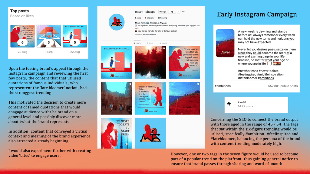 Following careful analysation, I implemented the SEO: #nevertoolate, #ageisjustanumber, #midlifeinfluence and #yourstory which sat in a six-figure trending, along with #inspiration, #ambition and #newchapter in the seven-figures. I was intent on maintaining no more than ten tags for each post; allowing around three additional tags concerning the context. These tags maintained a healthy balance in keeping within relevant trends, yet conveying the brand persona.