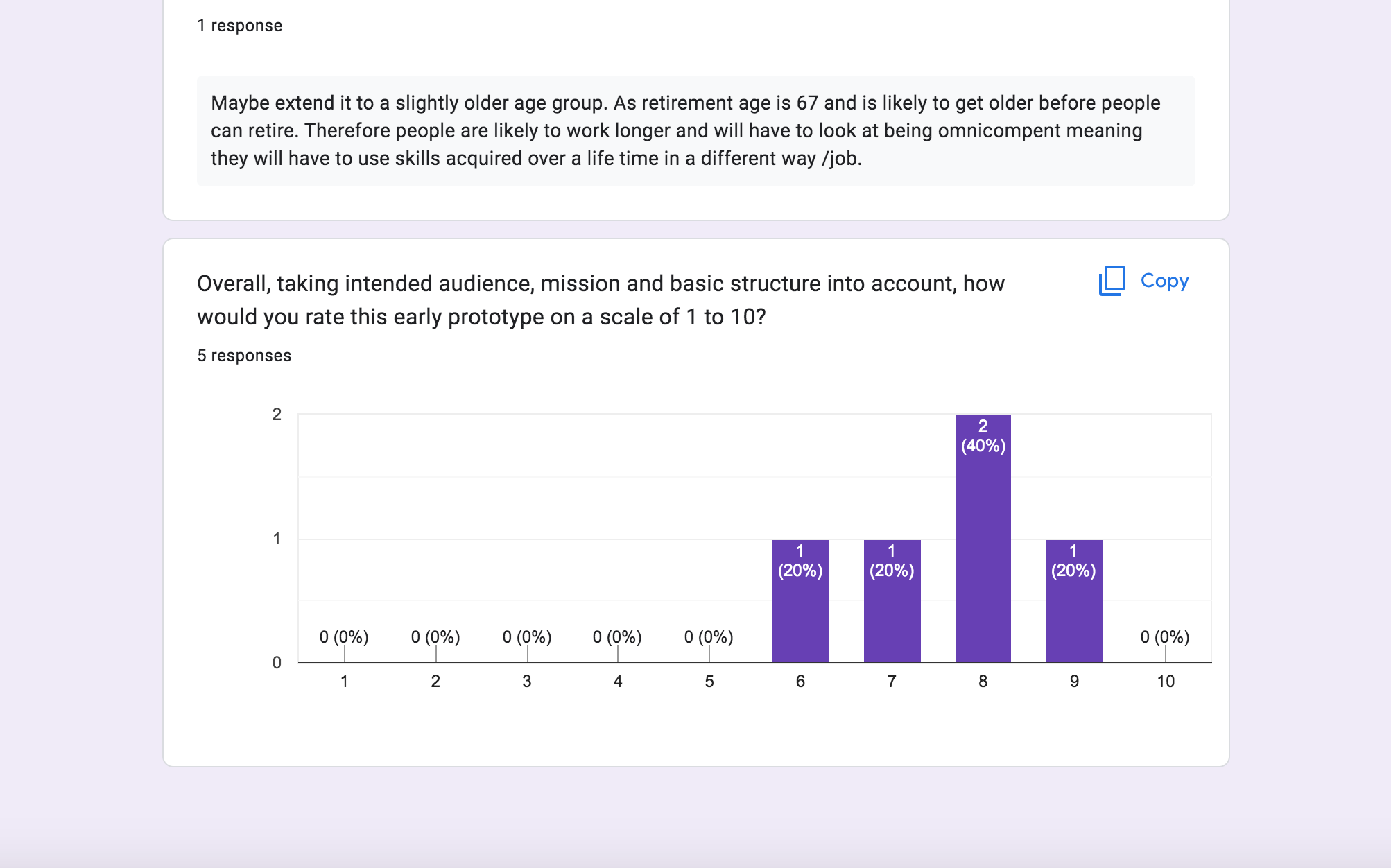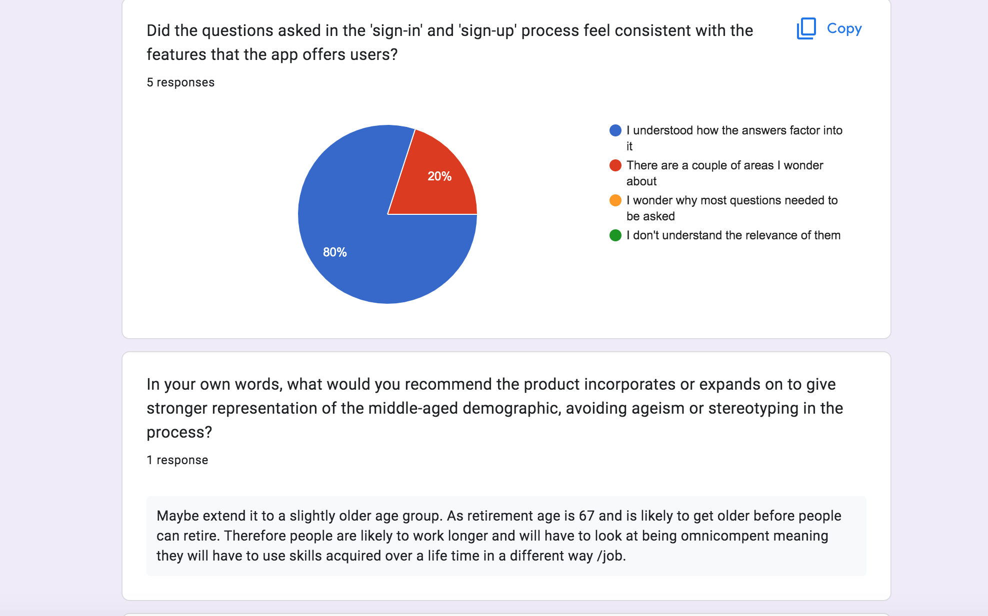 One final area of reflective research was speaking to the careers advisor who was among the candidates, to collect their opinion on the wireframe and what to consider for future designs or reassessments. They stated how it appeared simple in layout, but it could be more beneficial to apply a feature that utilised sound to help those mature individuals in the world who have visual impairment, giving a wider voice to the middl-aged stakeholders of the future.