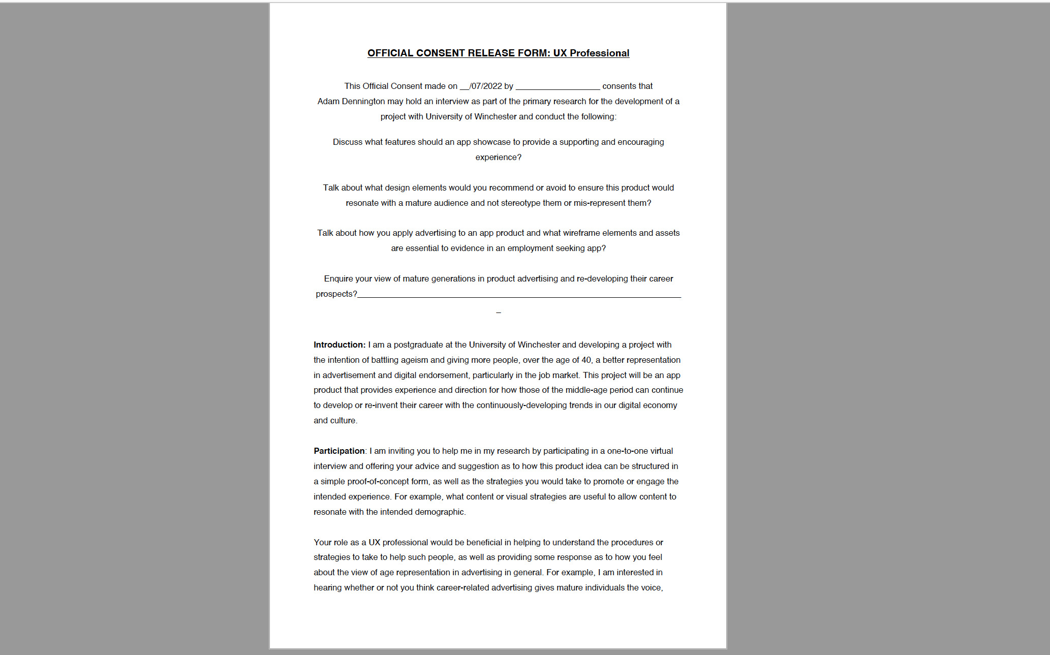 After much assessment of the wireframe, I sent the prototype to a selection of five different sources; two of these individuals included the UX practitioner and Age of Majority CEO, as well as a careers advisor and two individuals in the University’s Mature Student society.