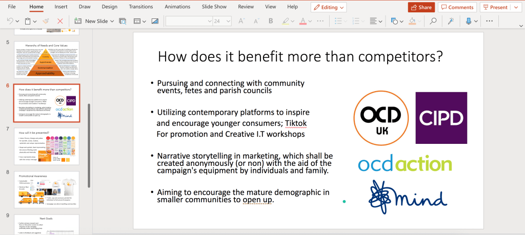 As a final touch, I summarised in five words what the brand values are and how it aims to achieve its ultimate goal. We need to listen to how individuals feel and what triggers their condition, then understand from their perspective how they live. When these are met, developing a process with the individual and those close to them is important, as well as feeding thoughts through engagement with other individuals attending sessions. After showing a bond with the consumers, we ultimately aim to unify the individuals with their friends and family, as well as their prospects to move forward.