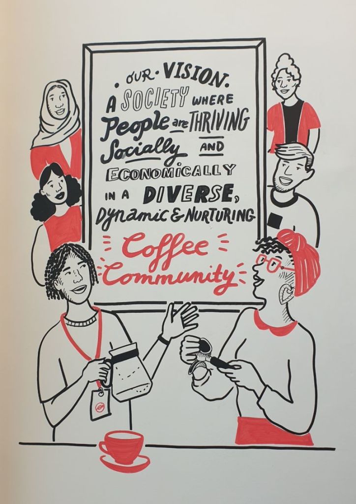 This beautiful piece, created for London-based beverage group, Well-Grounded CIC, illustrates a sense of humanity with individuals from different backgrounds, as well as fun, happiness and socialisation, thus encouraging consumers to visit the cafe. The typography motif of a stylistic aesthetic, specifically the juxtaposition of varying fonts and hand-written styles, adds to the sense of the brand identity being a service to make customers feel home-comforted, of which handwritten text is synonymous with, more so than a corporate business.