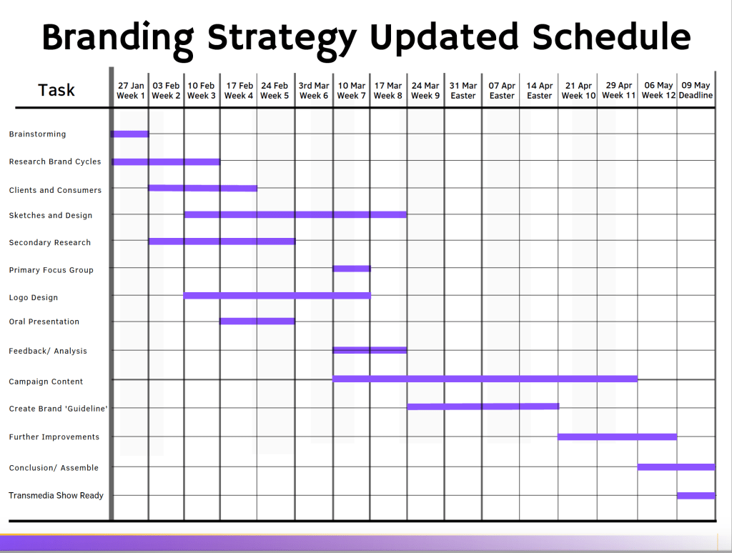 I updated my Gantt chart to reflect my process completed so far and to re-prioritise what components needed attention or re-scheduling, owing to delays in primary research or creative hurdles. I managed to successfully maintain the research and design elements of the project within my desired time span of the first few weeks. However, I had to extend my period of creating content for the campaign by bringing it earlier to accommodate the time I would use to create infographics, 3D printing and visualisation for the brand service. I considered possibly a 3D rendered van and podium to visualise how the campaign brand would appear in promotion at a conference or stall for the benefit of possible investors.