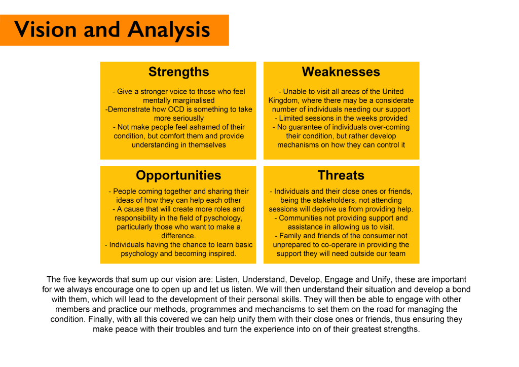 Regarding competitors, the prevalent groups established in the field of OCD are the organisations of OCD UK, OCD Action and TOP UK (Triumph Over Phobia), who have popularity in raising awareness of the condition. Despite viewing their websites and seeing the noble cause they do, one thing I noted was how I could not find any examples of when they have visited these particular areas on the map. They may not be aware of people with OCD living in these low-socio economic communities and they operate in the cities of London and Bath, both of which have low levels of people on prescribed medication for mental health, as stated by the Independent article.
