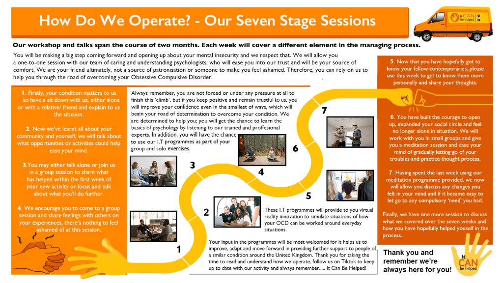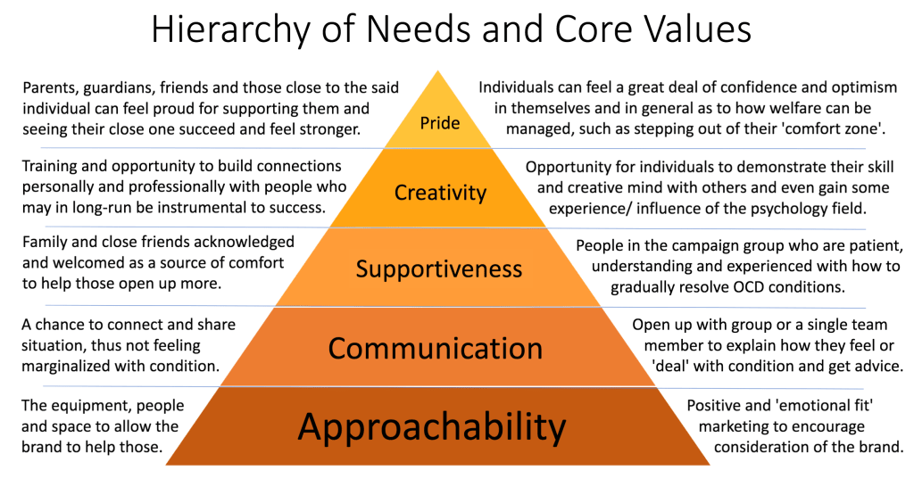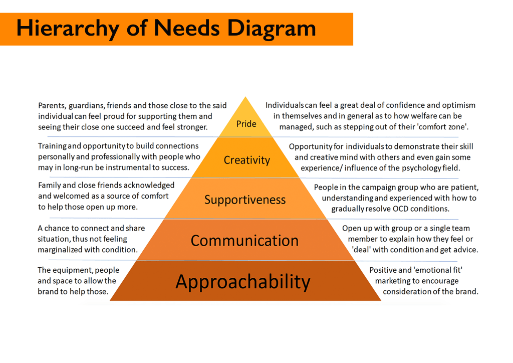 I decided on orange; it symbolises uniqueness, creativity and motivation which I want all consumers to feel when using the service, since they’ve nothing to feel ashamed about and we value their mindset. I would want to see them use their creativity in allowing us to work with them and find a balance as to how we can help them to evolve in their journey of managing OCD. In addition, there would be the opportunity for them to use exclusive equipment, either virtual or augmented reality-driven, that would allow their creativity to flourish and even possibly become more instrumental with future prospects.