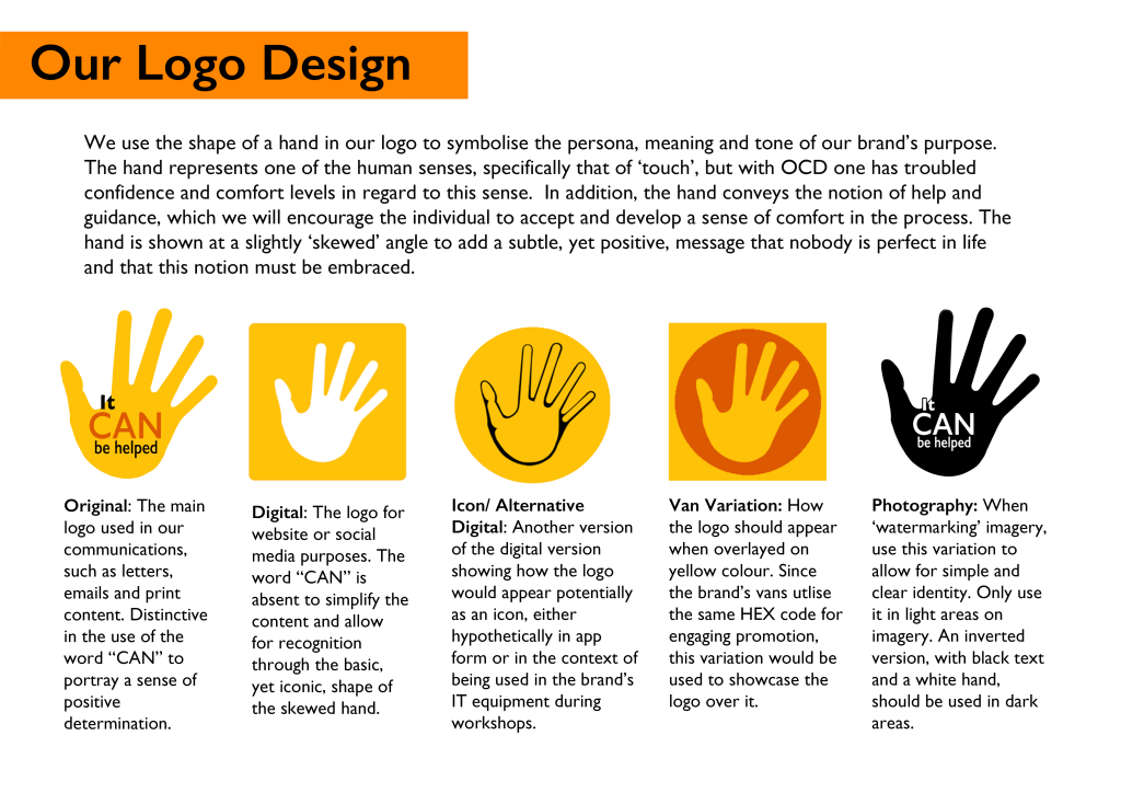 I experimented with a hand shape; the reason being was how the human sense of touch can be quite integral to OCD and a hand can convey many suggestions and expression, thus bringing an element of humanity to the brand. I created different interpretations of how the hand could appear in position and colour, whilst in conjunction with established text. However, the shape was becoming distracting from the word “CAN”, so I compromised the text and let the hand take the main focal point.