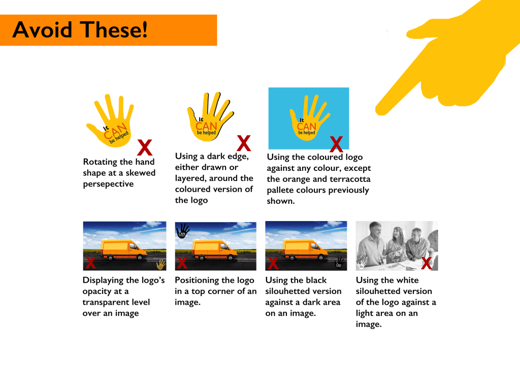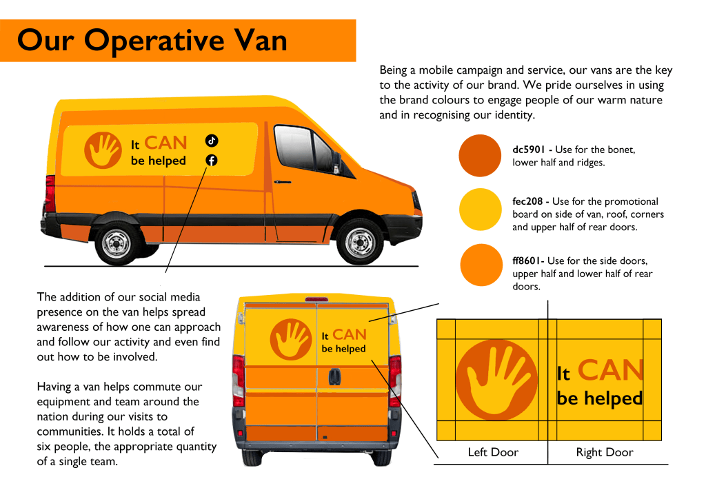 As previously specified, I ensured the colour was consistent and I utilised the hand shape as its own identity by communicating gestures which would be conveyed in the advertising for the brand. In addition, I produced a page that demonstrated how the commuting vans for the brand’s mobility would be presented among people and how the logo should be presented when used on the van’s yellow background by creating a version of the hand against the terracotta orange.