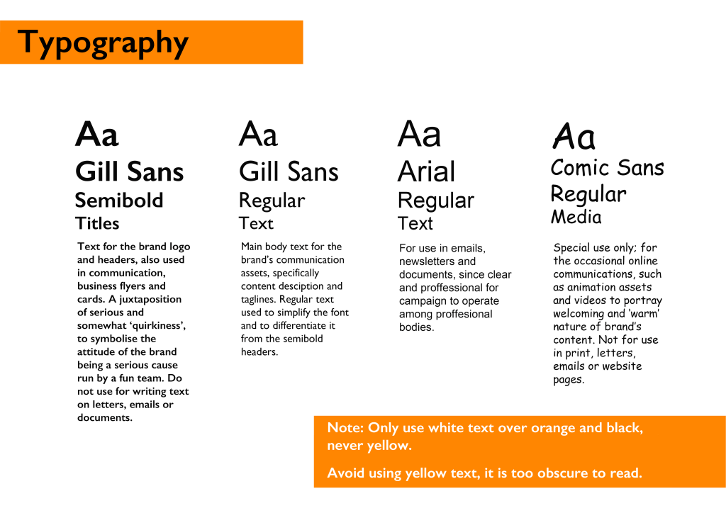 I settled on: ‘bc3e00’ (orange) to create headers, borders and background detail in the brand’s communication assets and ‘dc5901’ (Terracotta) would be used for the “CAN” on the logo, as well as shapes where light text was required to overlay. One particular issue I encountered was the yellow colour used up to this point; the HEX code of ‘fece48’, proved rather obscure against a white background and difficult to identify. To resolve this, I cited the logo for fast-food brand, McDonald’s; it used a HEX code of ‘fec208’, making for a subtle and clearer shade of yellow, this colour reference was used for the hand symbol and any objects that would overlay terracotta.