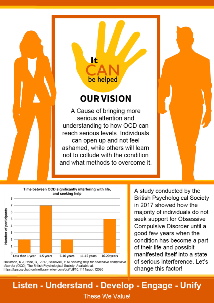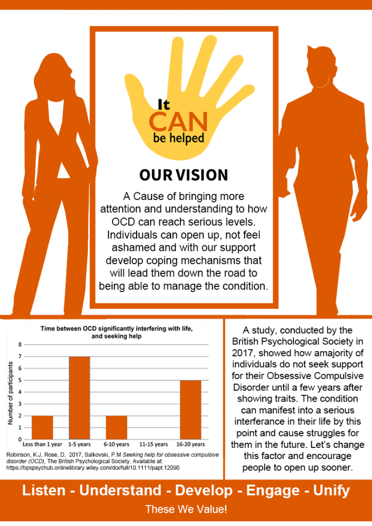 I discovered a graph through reading an article on the British Psychological Society, which itself sourced from Cambridge Core. I decided to apply this figure to the vision statement to add further clarity and relevance, regarding the reason why this charitable campaign matters. The graph states how a majority of individuals do not actually seek support until a few years after developing traits of the condition, thus demonstrating why my brand exists to see that more is done to help people open up and receive support quicker, avoiding long-term difficulties.