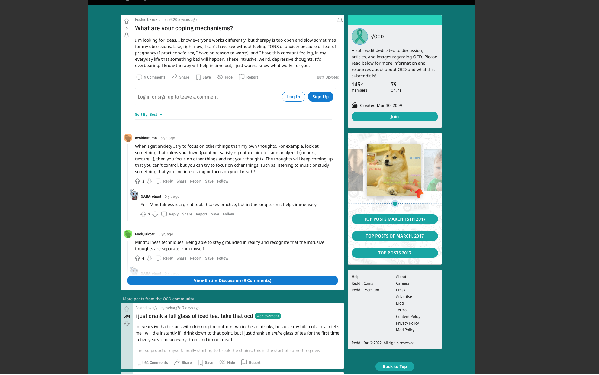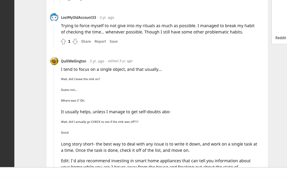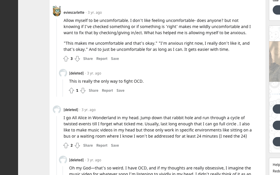 Looking at various blogs on Reddit, I took note of exercises that could be explained, through the use of infographics, how the brand’s sessions would function for consumers. Many people stated how they eased their mind by focusing on particular objects or indeed conducting their own meditation session to loosen the mind of impulses that dictate them. In addition, one further person noted how they kept a sketchbook close on hand to draw or write down their ‘desires’, which the condition pushed them into believing they should do so. This was an effective way to gradually ease the need for these internal struggles, so I added these coping mechanisms to the structure of how I would design my brand service through infographics.