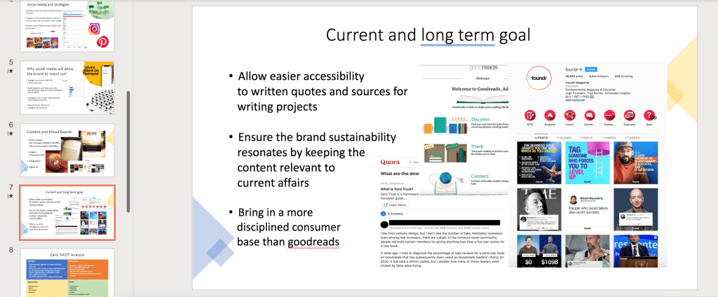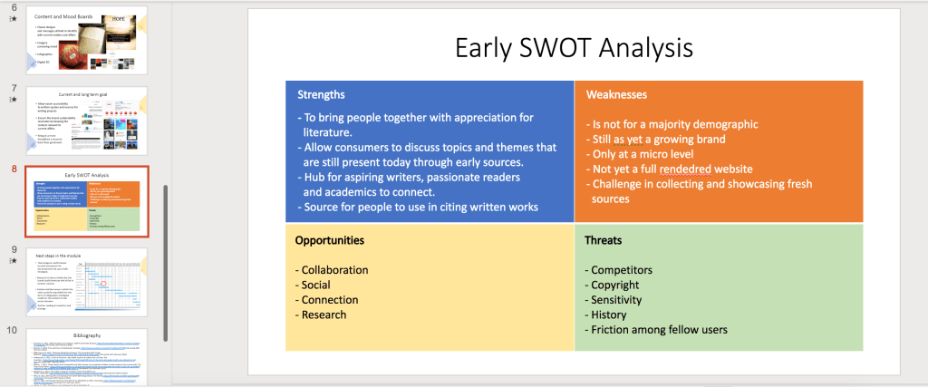 Regarding threats, aside from the obvious social media competitors, there was the issue of whether copyright factors could work against the showcasing of an author’s work. While this would be resolved by ensuring that the works showcased were within the realm of public domain, there was still a threat that some spam or ‘troll’ could attempt to displace this onto brand without doing proper research.