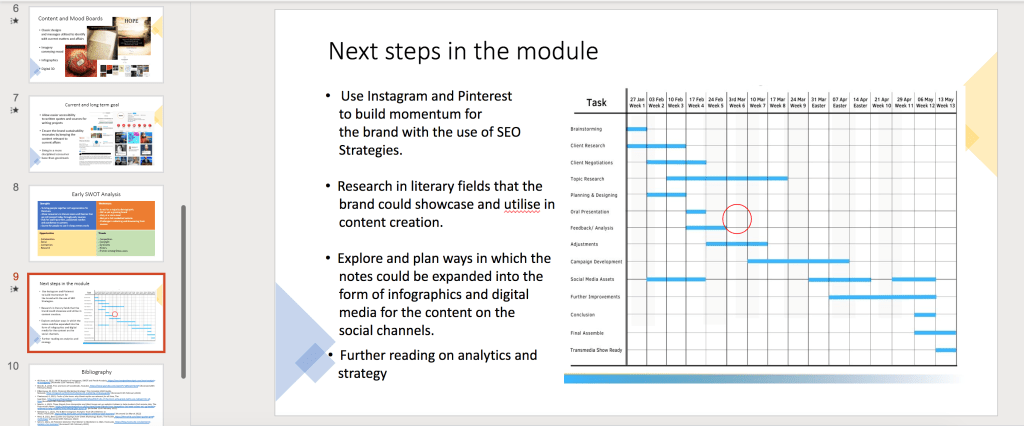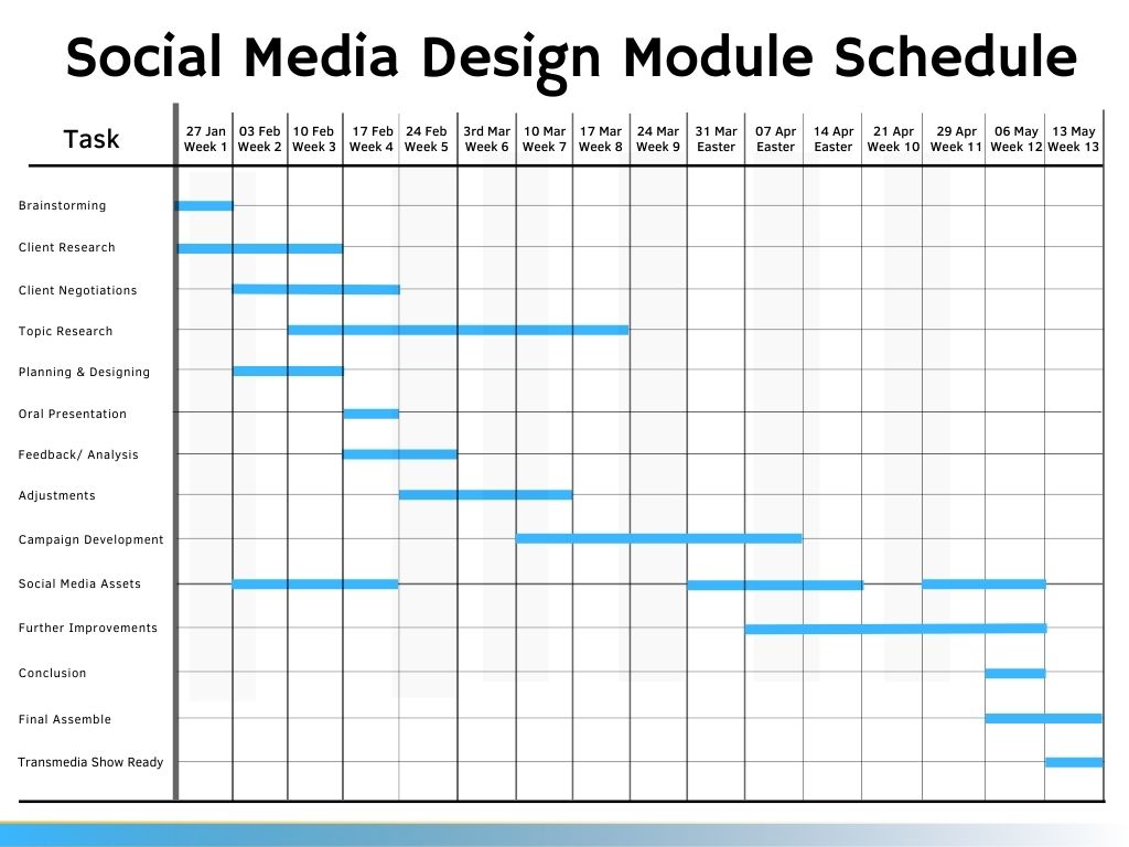 I created a Gantt chart in the early semester to initialise how I would prioritise my aims for the weeks ahead. It was my intention to use the majority of the following six weeks to focus on how I would plan the content and identify the trends and metrics to follow, based on competitor research.