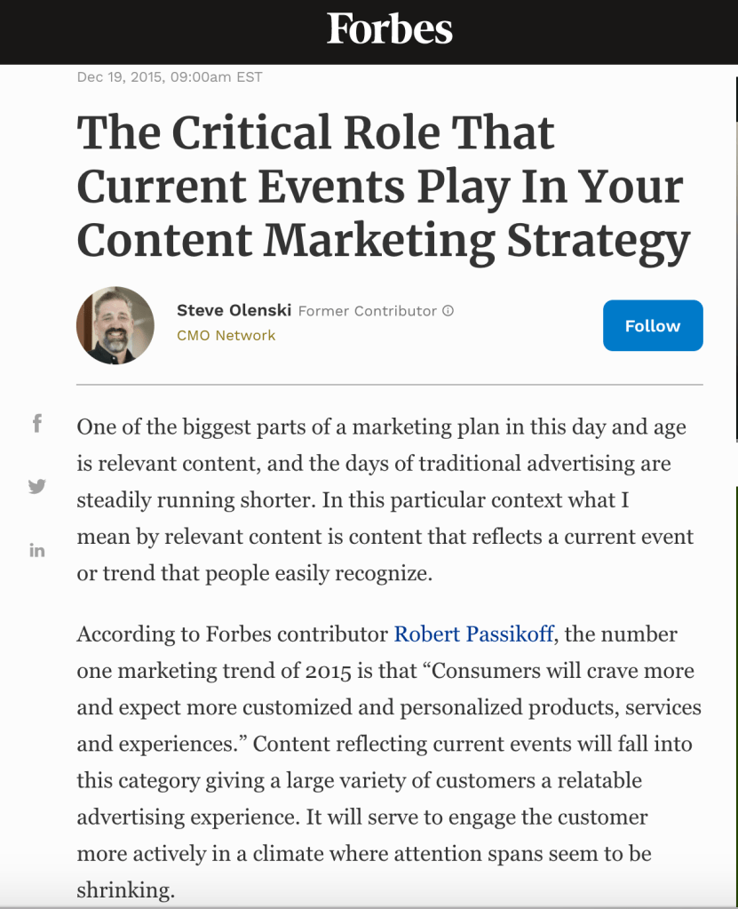 Available at: https://www.forbes.com/sites/steveolenski/2015/12/19/the-critical-role-that-current-events-play-in-your-content-marketing-strategy/?sh=ac0a4a42607b (Accessed 13th February 2022)