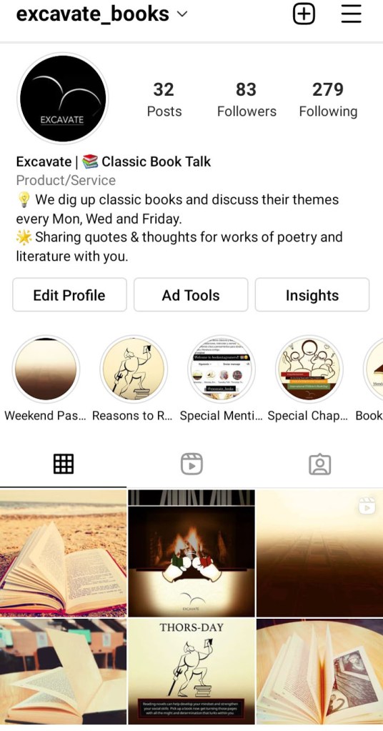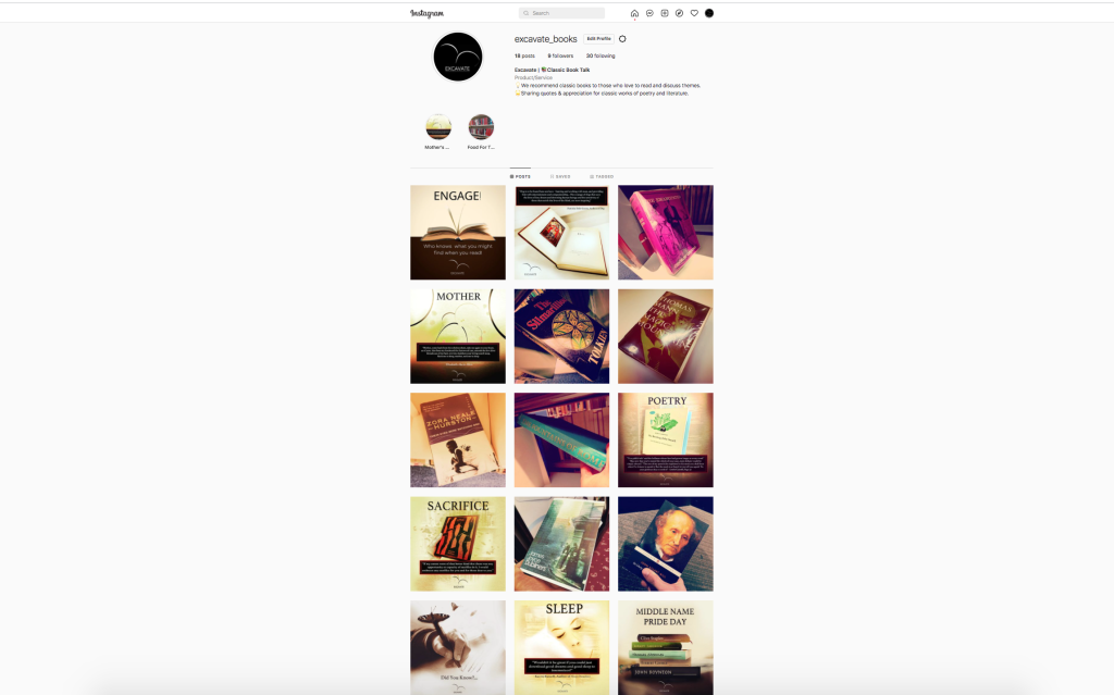 The account had 18 posts at this point, but the content appeared to deviate too much; the colours clashed and the showcased books switched from vintage hardback editions to contemporary paperbacks. I deemed the posts which utilised beige and brown colours as the perfect identity for Excavate, since they gave the consumer the impression of it’s warm persona.