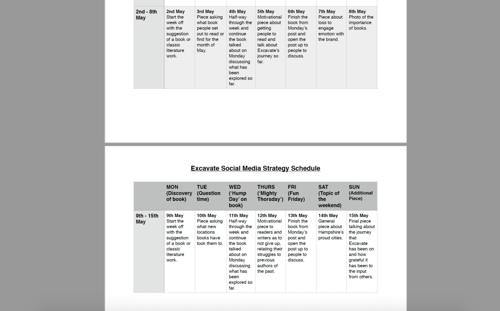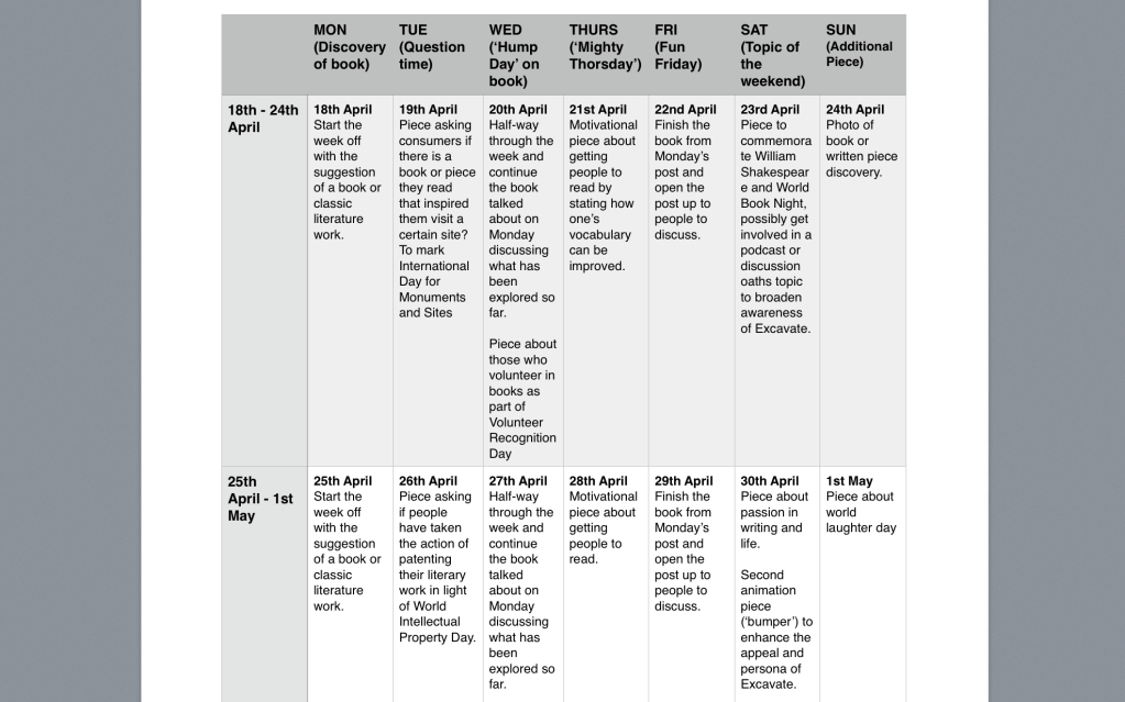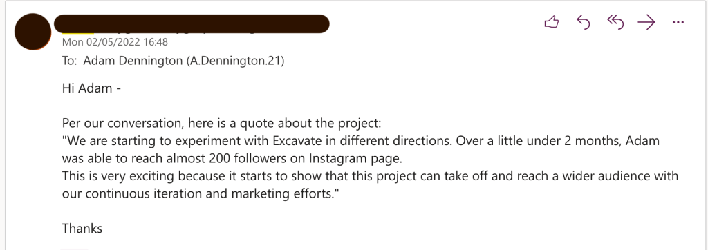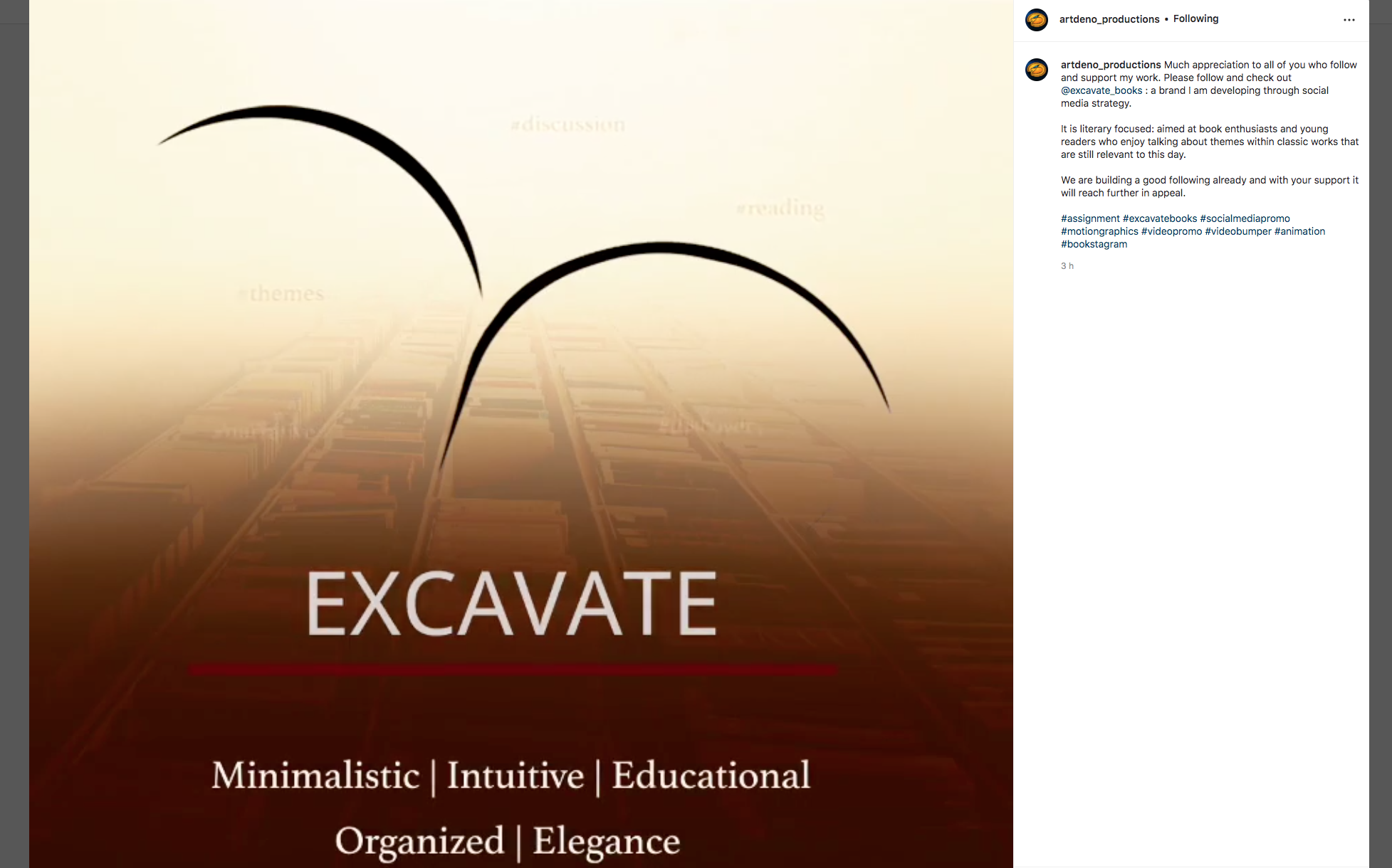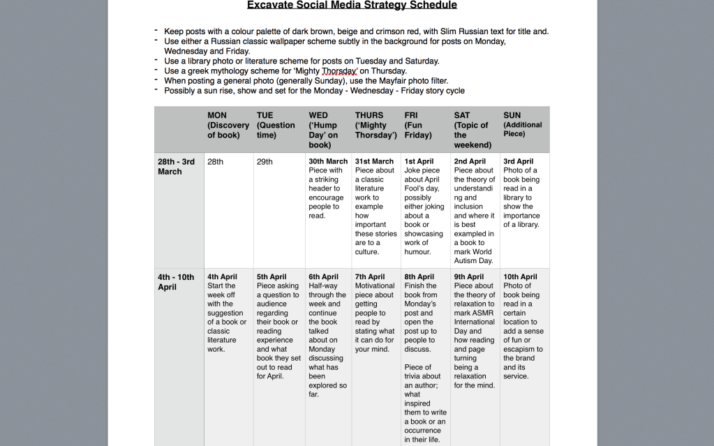 The client eagerly anticipates the following Excavate could amass, reaching its potential of the single thousand figure within its first year owing to the effort of my social media strategy. This project has sharpened my mind and given me the motivation and awareness of how to approach such a role in the future, as well as how to benefit a brand through the important considerations of SEO and the particular audience who gravitate towards the said platforms.