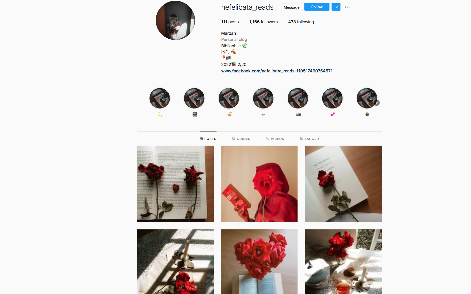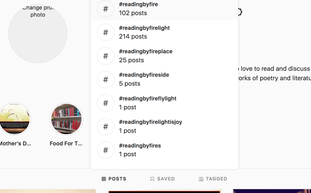 I suspected these accounts had posted years back and thus may have capitalised on the term when it was growing in popularity. In addition, these accounts had a following in the tens of thousands; I was not quite at a competing level with these account’s following, so I was intent on identifying accounts that were within the quantity of the hundreds to the low thousands. I searched tags that related to the themes of Excavate, such as #rarebooks, #bookandcandles, #cosyreading and #bookdiscoveries, upon which I found examples of further accounts that would appear to be more comparable.