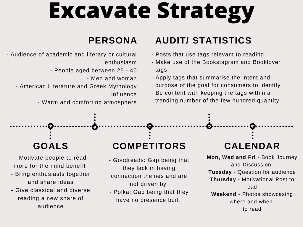 While more linear and in line with a ‘mature’ reputation, Twitter and Linkedin were on the other extreme of the social spectrum. These platforms could lead to Excavate falling victim to the ‘square’ persona that I was intent on the brand avoiding. Therefore, it came down to Instagram and Facebook as the candidates; they each had the ideal balance of catering to the millennial generation of consumers, aged from their mid-20s to mid-40s, of whom my client and myself had figured as our target audience, being the correct age of a ‘young-maturity’ to embrace the relaxed persona and appreciative of books.