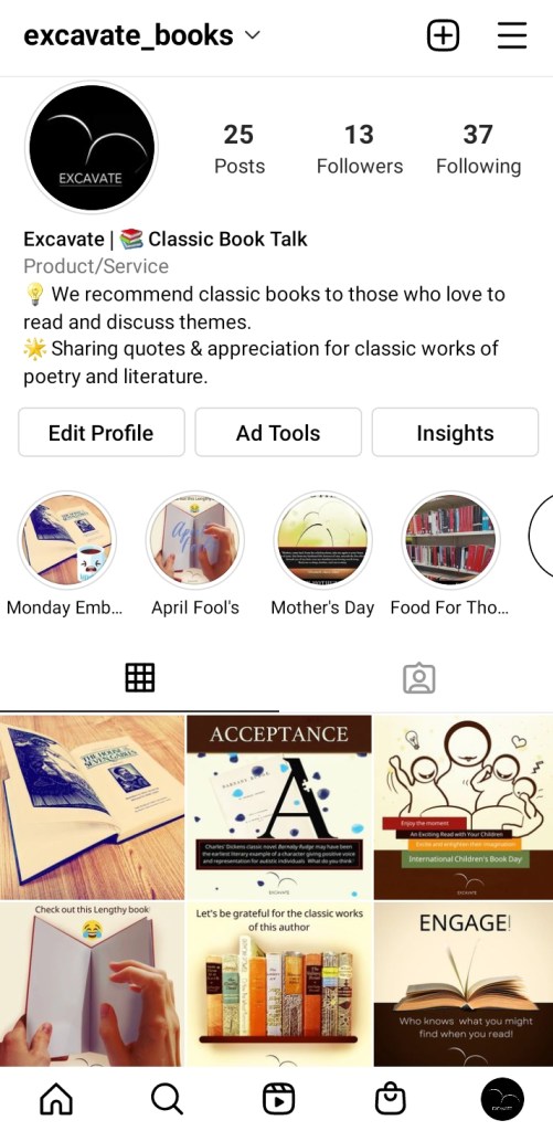 I took time to look into a few particular Instagram accounts, based around literature, that utilised various strategies to connect with their target consumers. I had already analysed the account of my client’s visionary competitor, Goodreads, but since Excavate was a small-brand it made sense to target accounts of this nature in regards to how the strategy would perform.