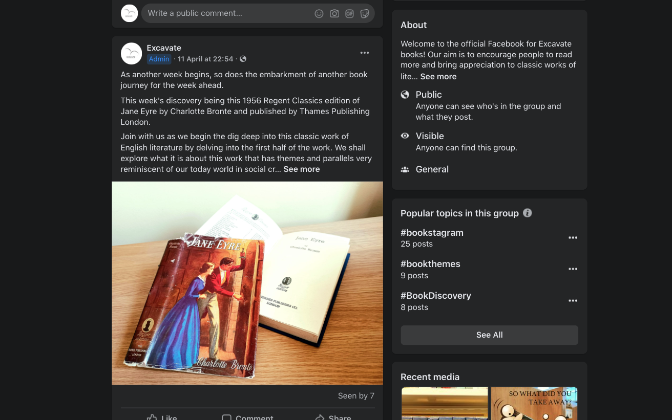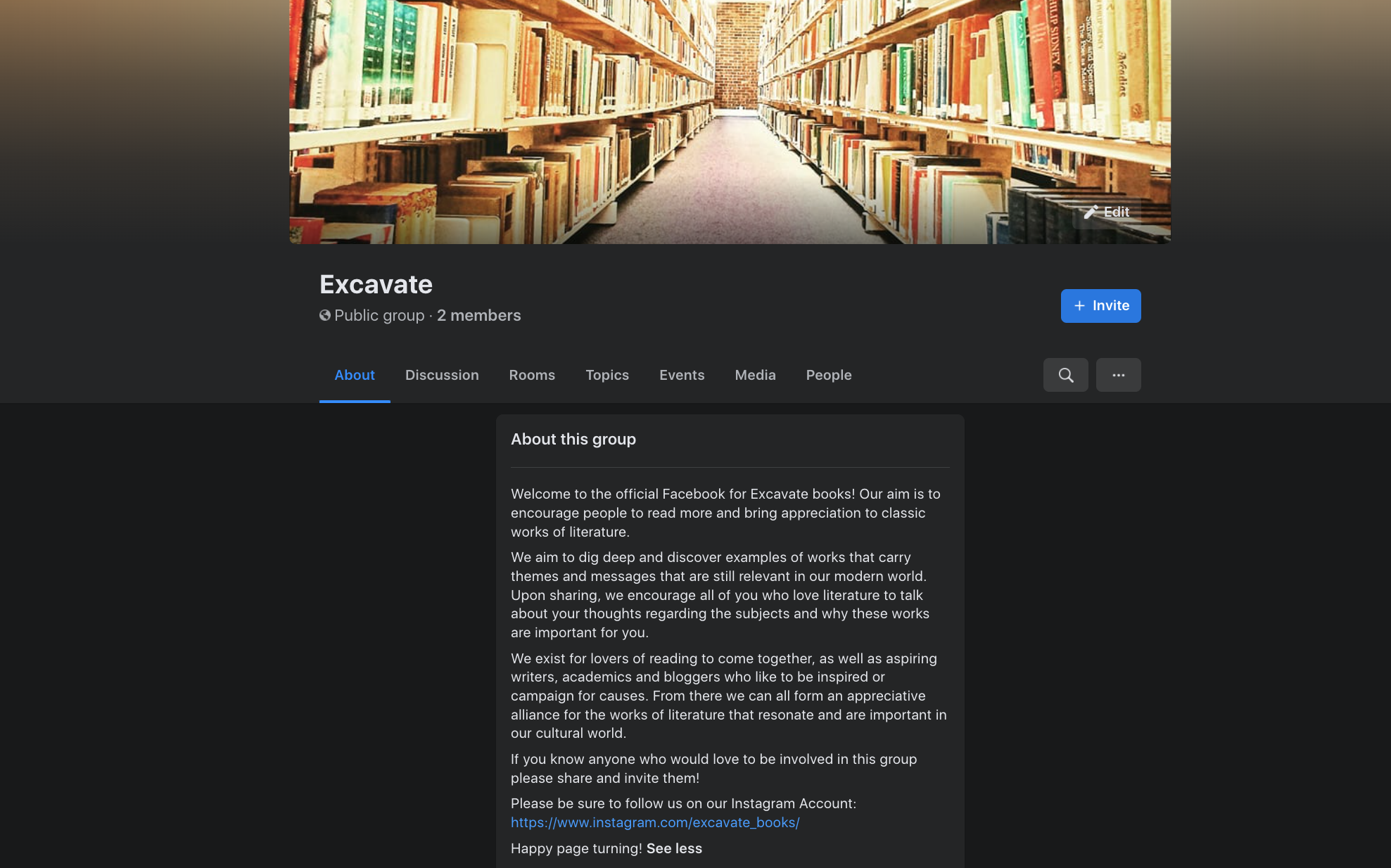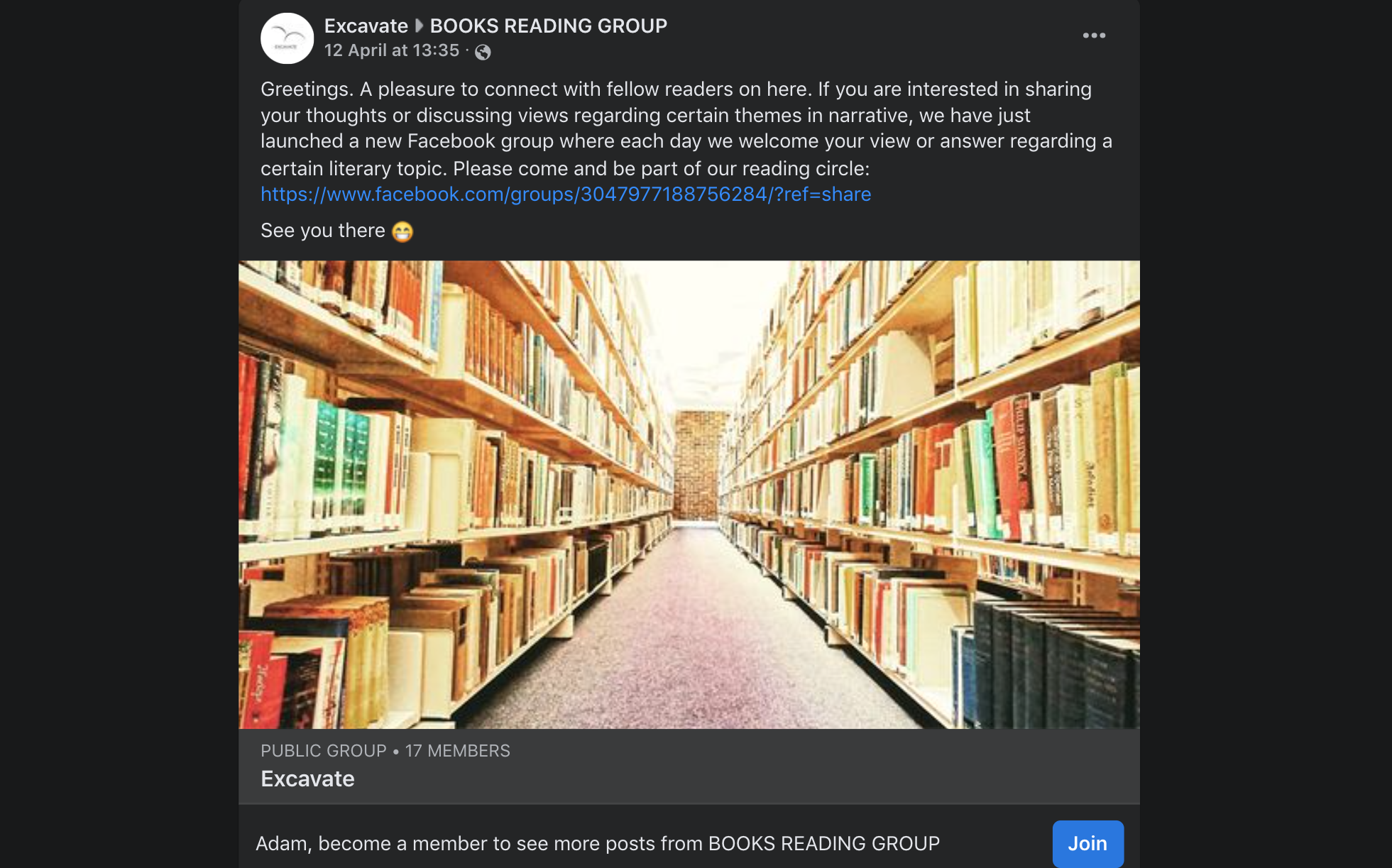 I launched the Facebook group; it would be an extension of the progress that Instagram had done in captivating the consumers and encourage the brand’s secondary aim of bringing readers together. The Facebook group, in other words, was a haven for supporters of Excavate to feel more connected in a community upon discovering it’s Instagram presence and becoming included in the activity.