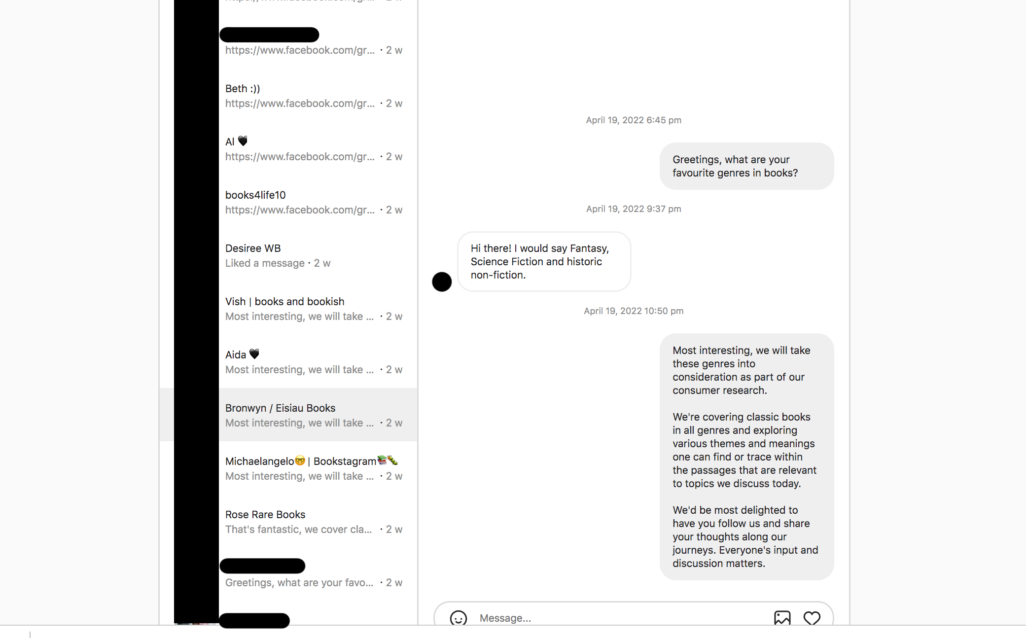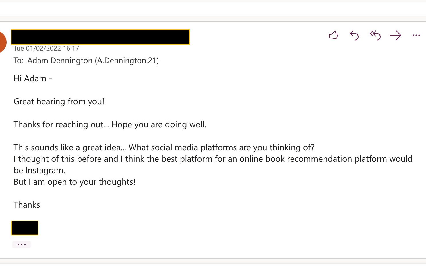 Understanding particular target consumers, questions were asked as to what genres they enjoyed or where they liked to read as a way of knowing what to share or cover in the form of content to resonate and connect emotionally with them: what they like about books, hearing about their favourite genres and encouraging their input, thus finding how our content would resonate with our core support (Figure 40).