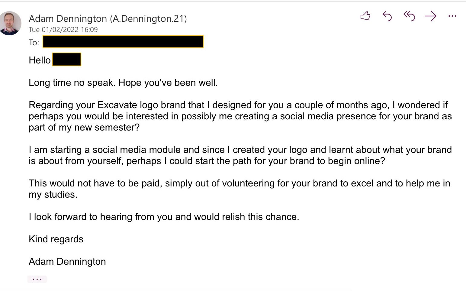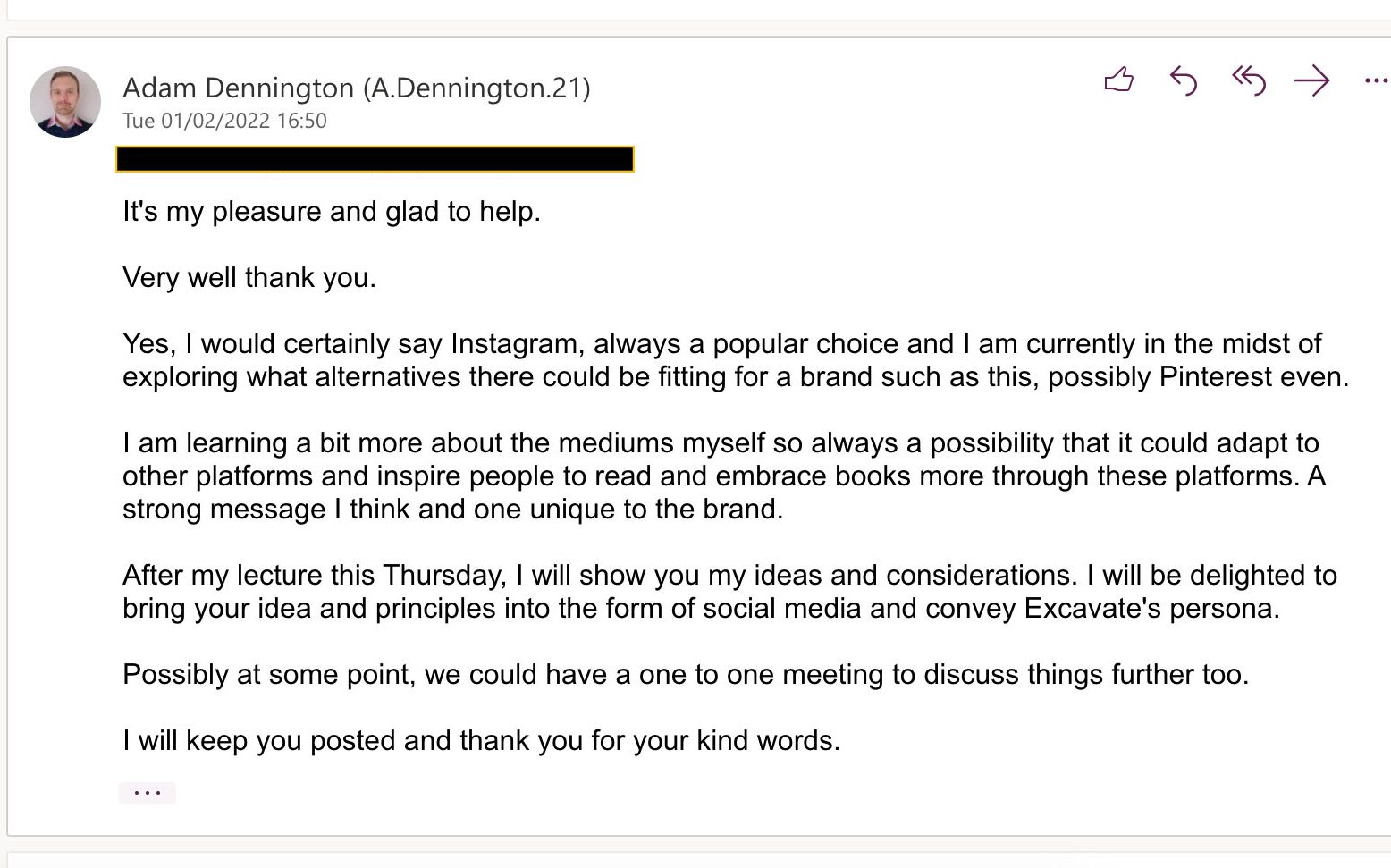 I am most satisfied with the accomplishments of Excavate; this has been an interesting module, setting out to produce a client-focused project and moving into uncharted territory is one that I will find myself within from an industry perspective; the task for any agency is about understanding the client and identifying the requirements for how a strategy can be developed to meet their fulfilment.