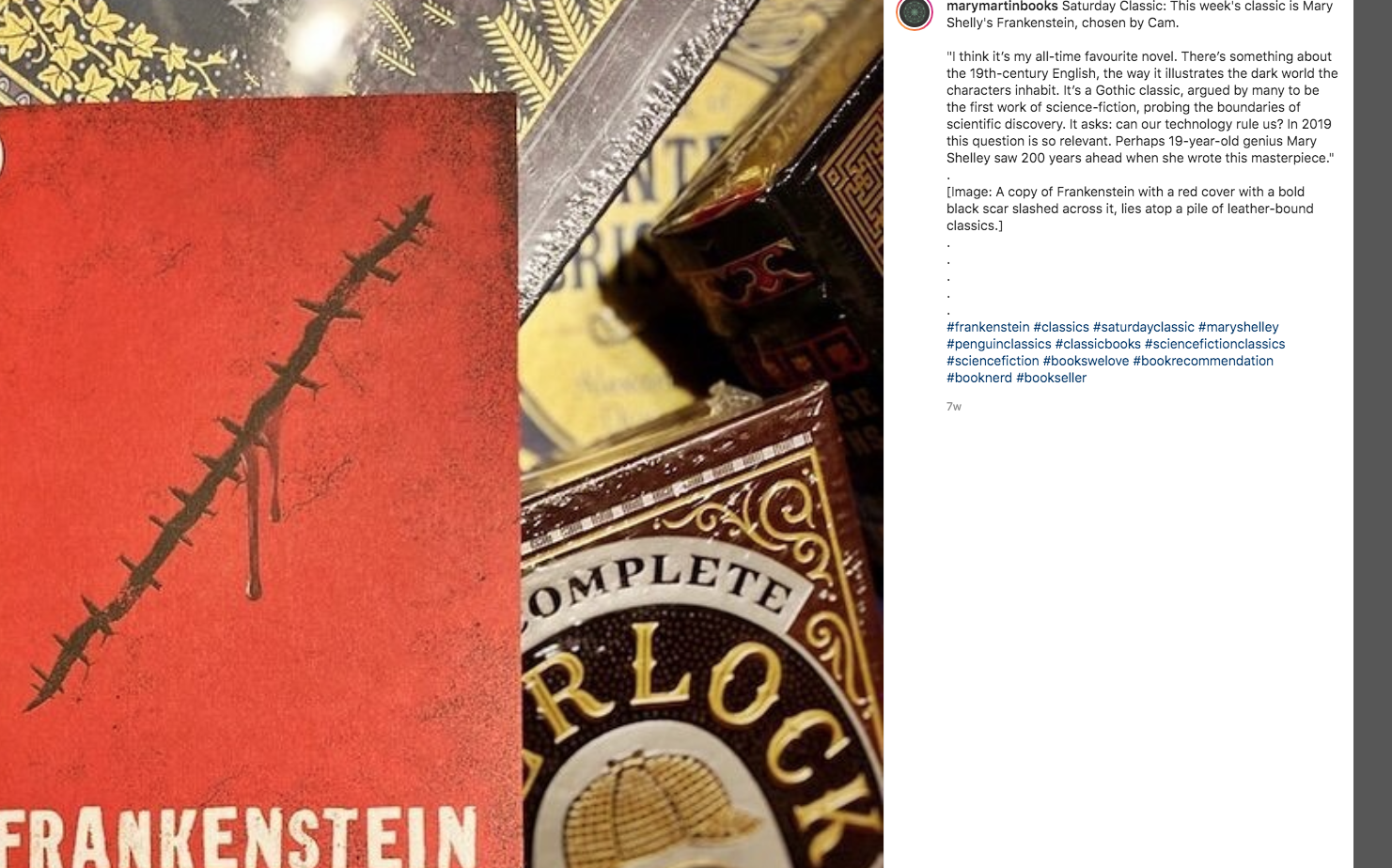 I analysed the SEO tags on these accounts, particularly in the early posts, to establish a sense of how these accounts managed to build popularity. A trending tag that they had all used: #bookstagram, seemed prevalent on many literary bloggers. It has been making the rounds on Instagram for a few years and as of the time of my discovery had accumulated a trend of 75 million tags. I figured it could help the content in getting recognised considering how these accounts had appeared to embrace the popular trend in their early stages, such as another account: marymartinbooks (Figure 19).