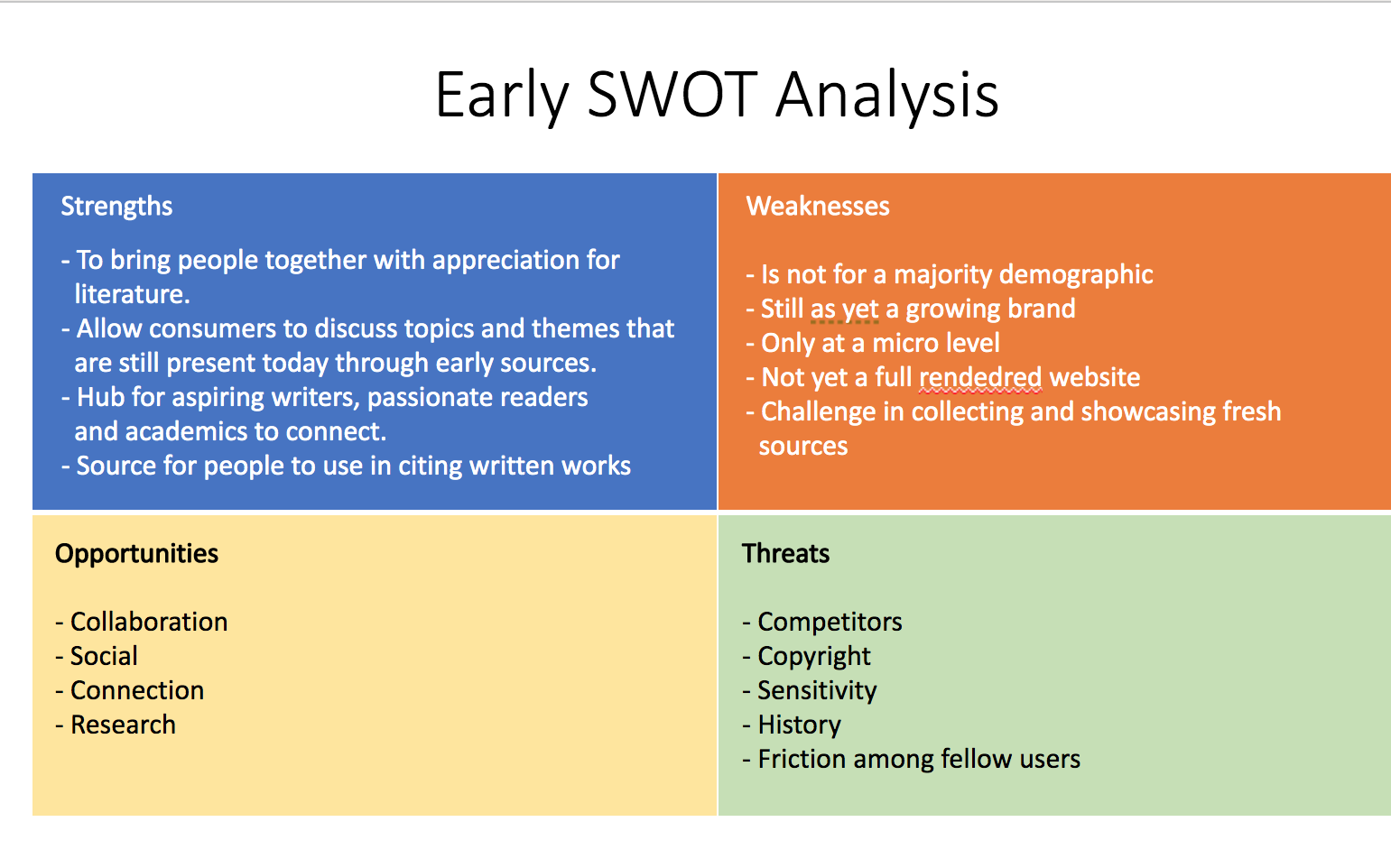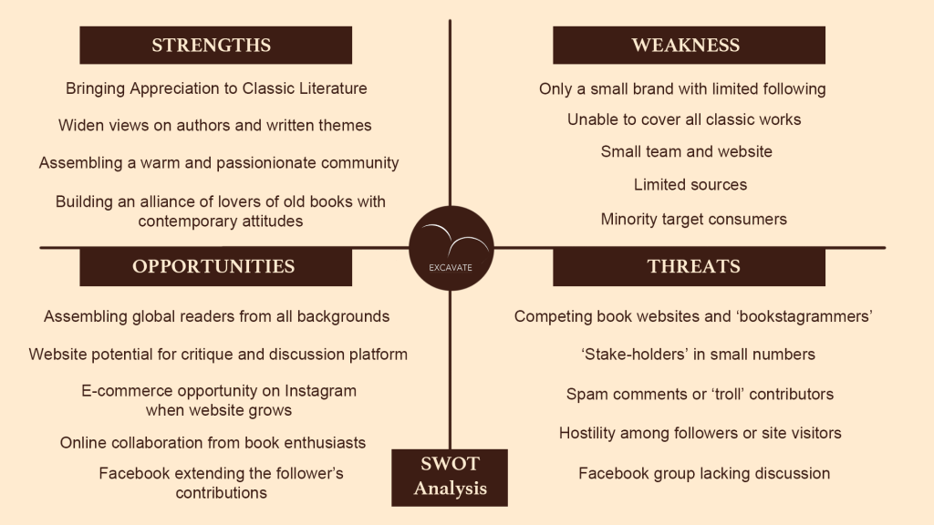 I formulated my Strengths, Weaknesses, Opportunities and Threats (SWOT) diagram to summarise what Excavate does for users, what makes it different from fellow websites hypothetically and why Social Media works to its advantage, such as building social circles and spawning opportunities for fellow readers to build discussion about vintage works made it an area of positivity.