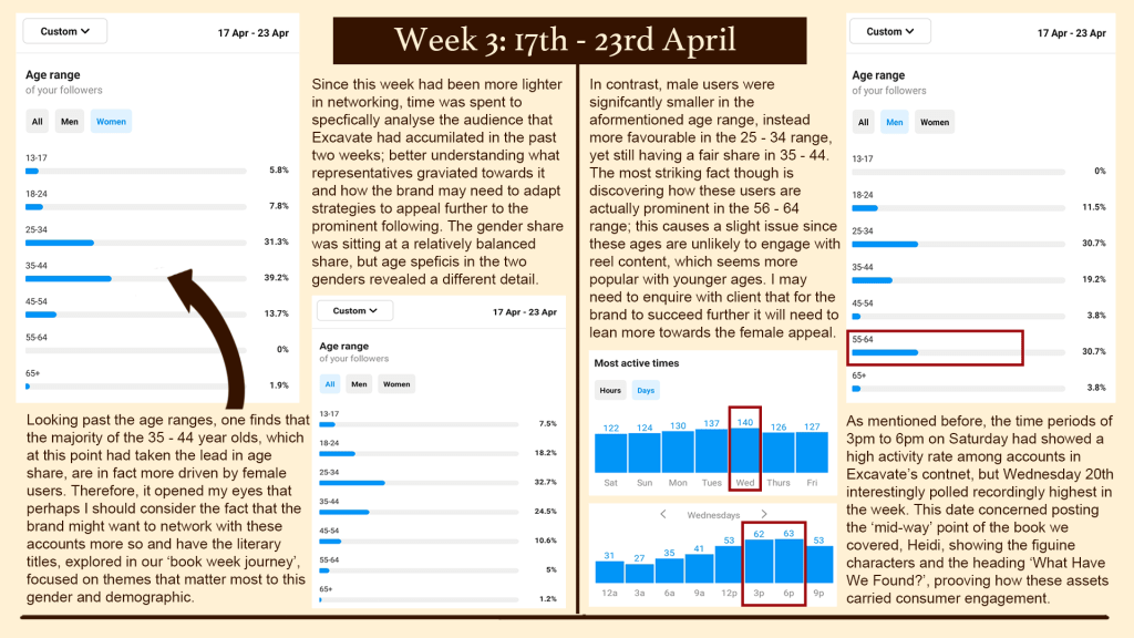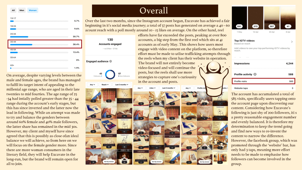 One can see that the brand has had its share of hits and misses based on statistical figures (Figures 50 and 51), but overall has had a steady and neutral flow considering it is still in early stages and was building promotion for a soon-to-be website. I have realised that possibly I should re-consider the Facebook option regarding the second platform, it would appear Facebook does not quite manage to engage book enthusiasts since many do not use it for that matter, whereas Pinterest is more effective in this subject (Gamble, 2021, online). My client compromised upon our final meeting of moving Excavate more towards the female demographic; I stated how it proved to be more beneficial in pulling the brand forward. They agreed and felt the current balance was acceptable enough for them to re-consider, but we would keep the male appeal relevant once we establish the website. As a result, a Pinterest will be explored in the brand’s next stage as the website unfolds, hopefully allowing the facebook to become more prominent in the long-run.