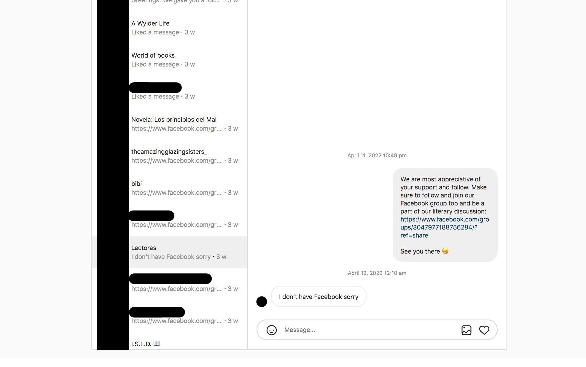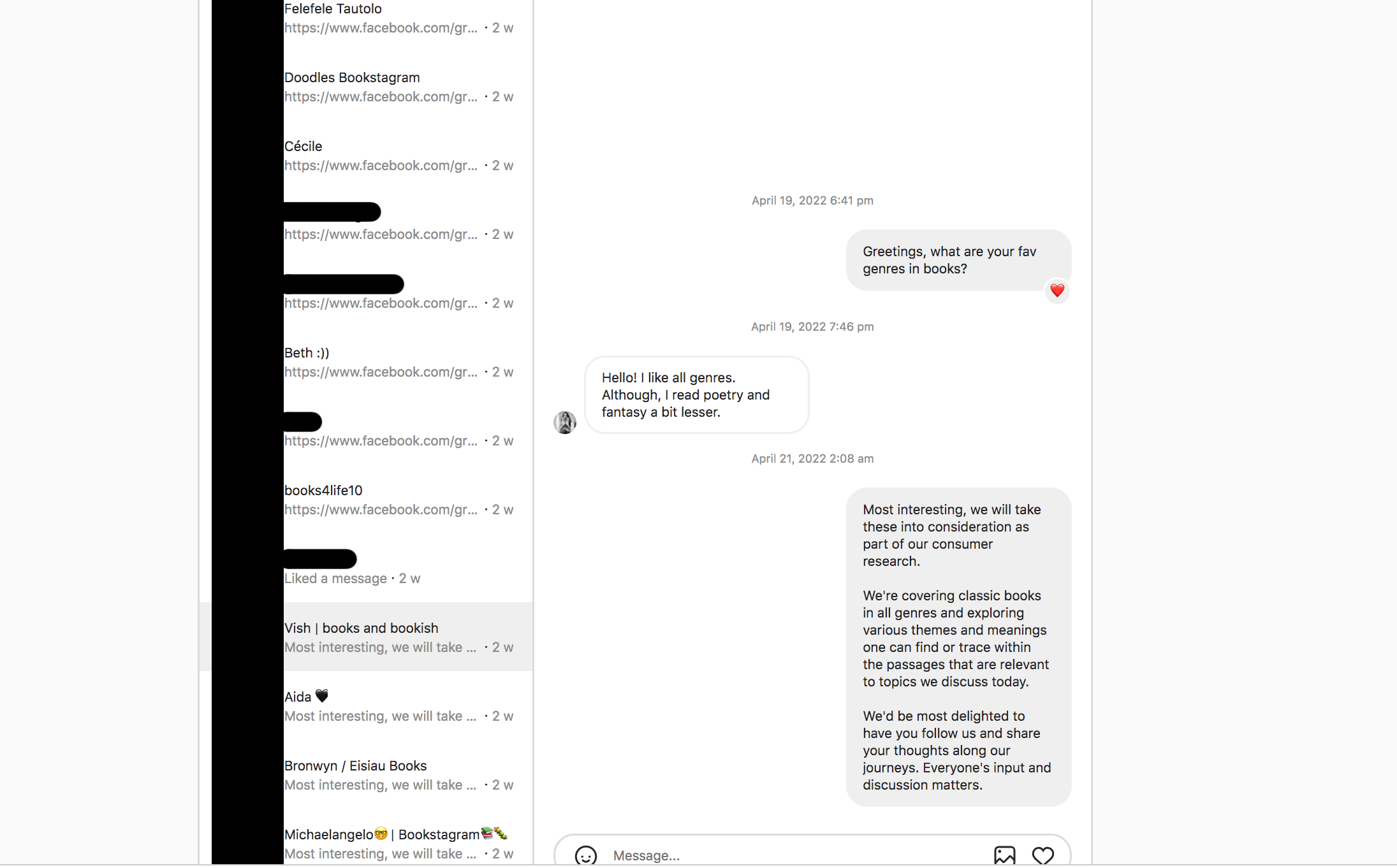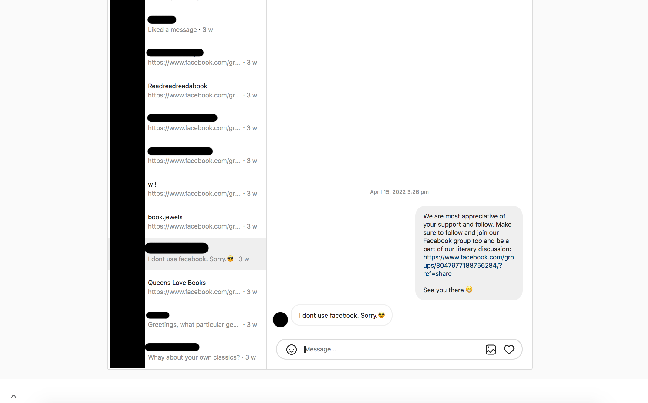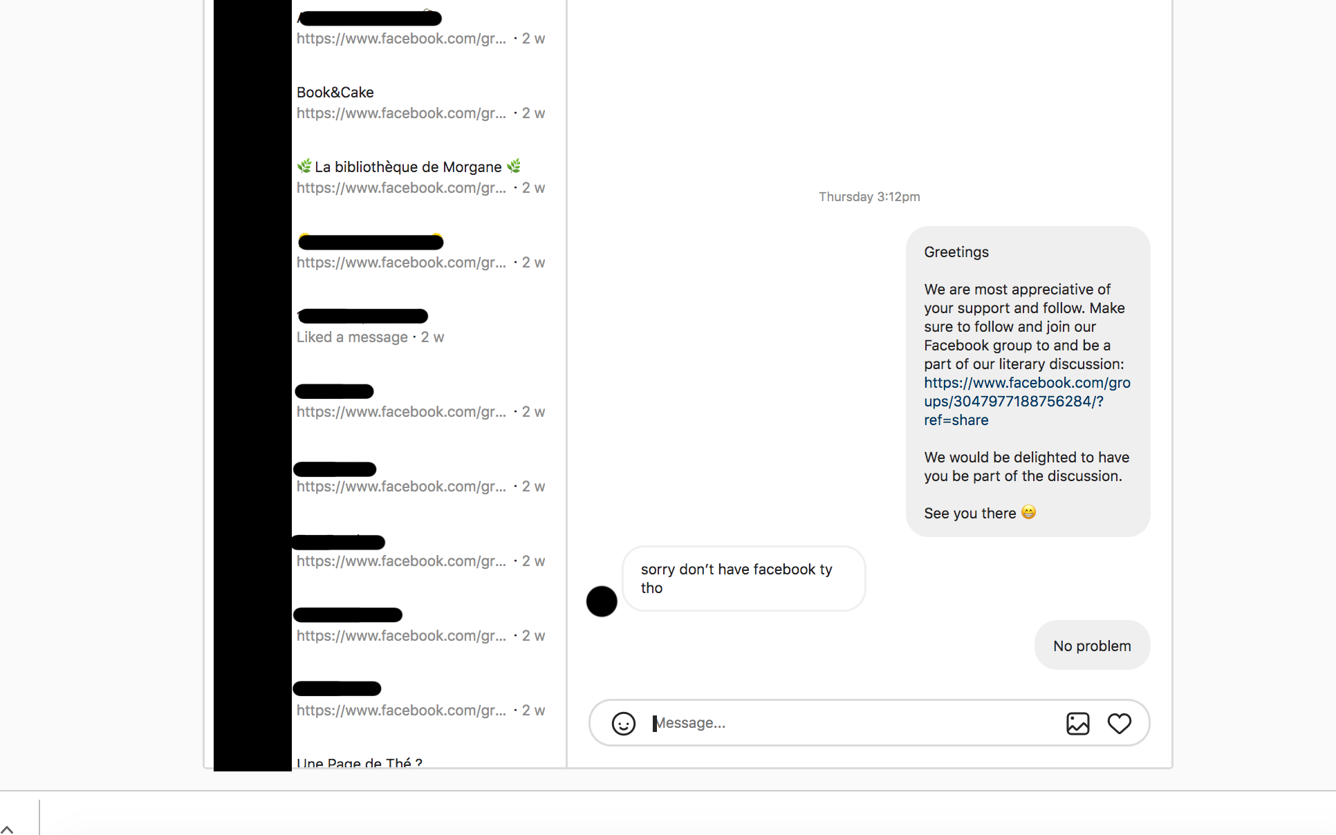The group was further promoted through Instagram; I used the group link in place of the website as a means to inform our followers of how they can discover more of the brand and become further involved with our activity. In addition, networking helped in suggesting the group to users who became intrigued by our content, although sometimes occurrences would show that Facebook is not widely used as one may assume, such as these messages below (Figure 47).