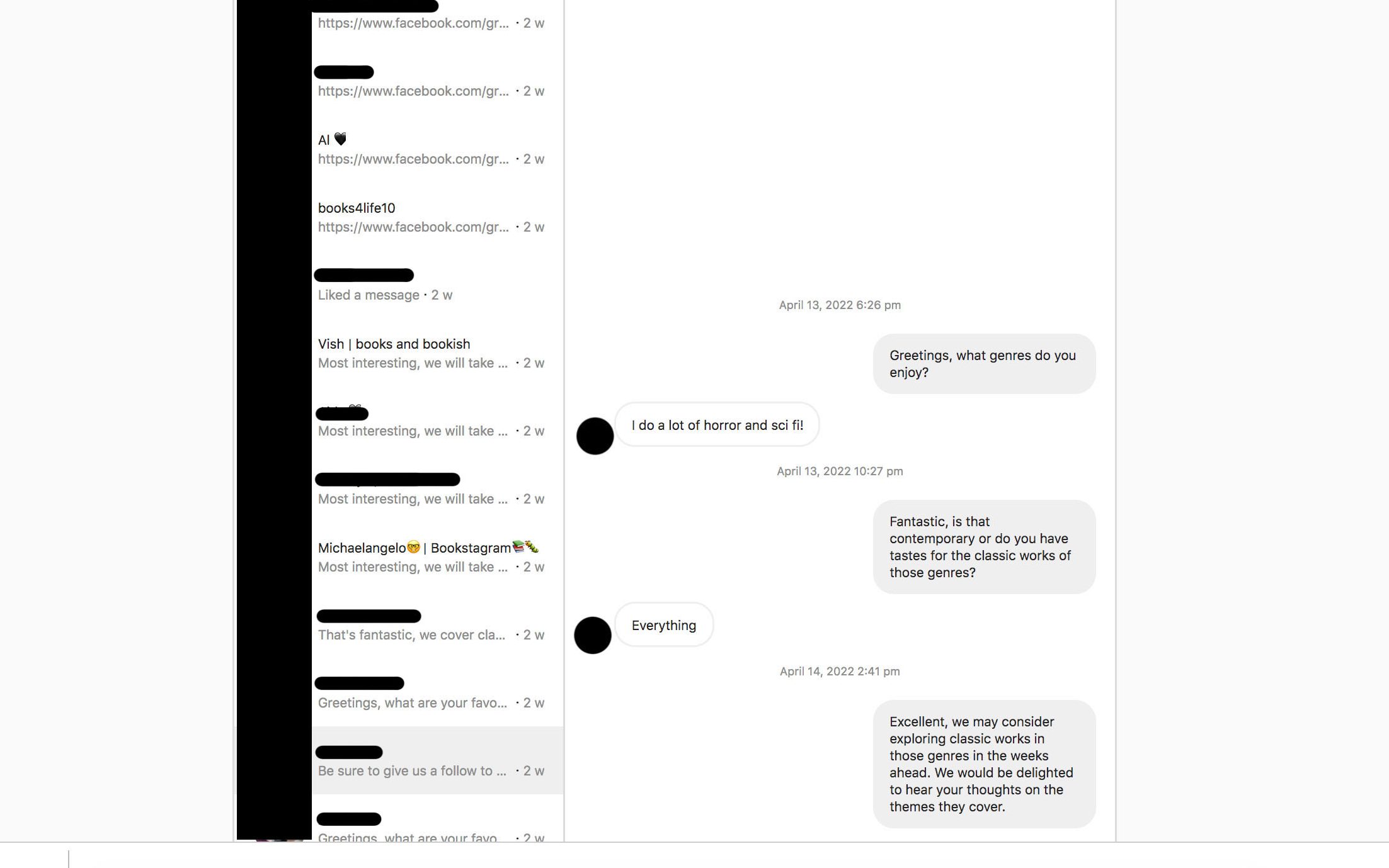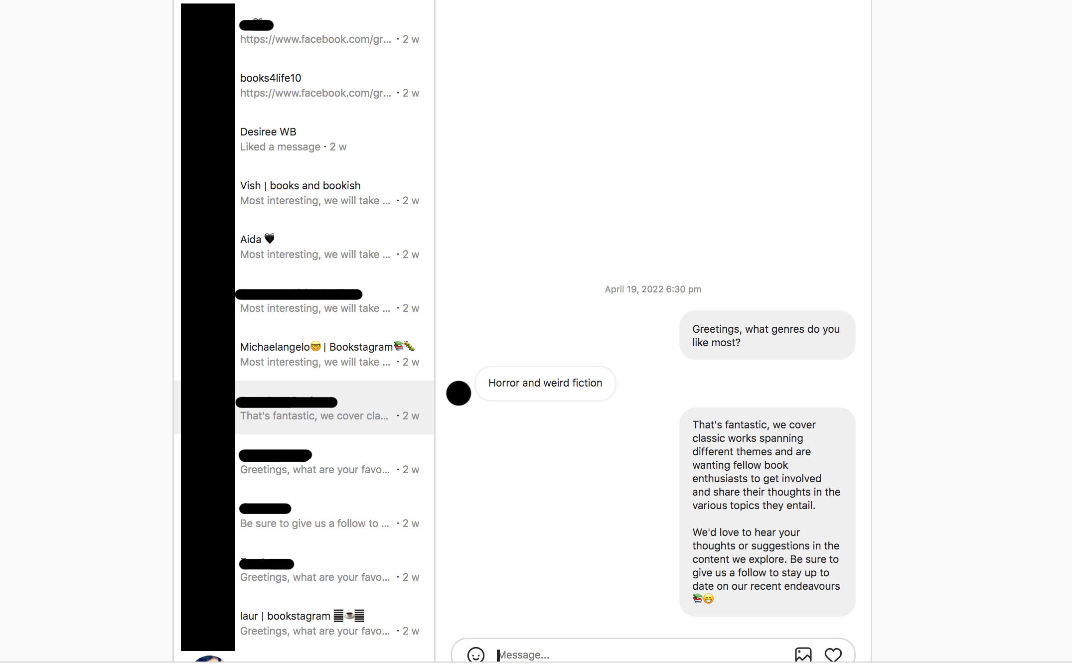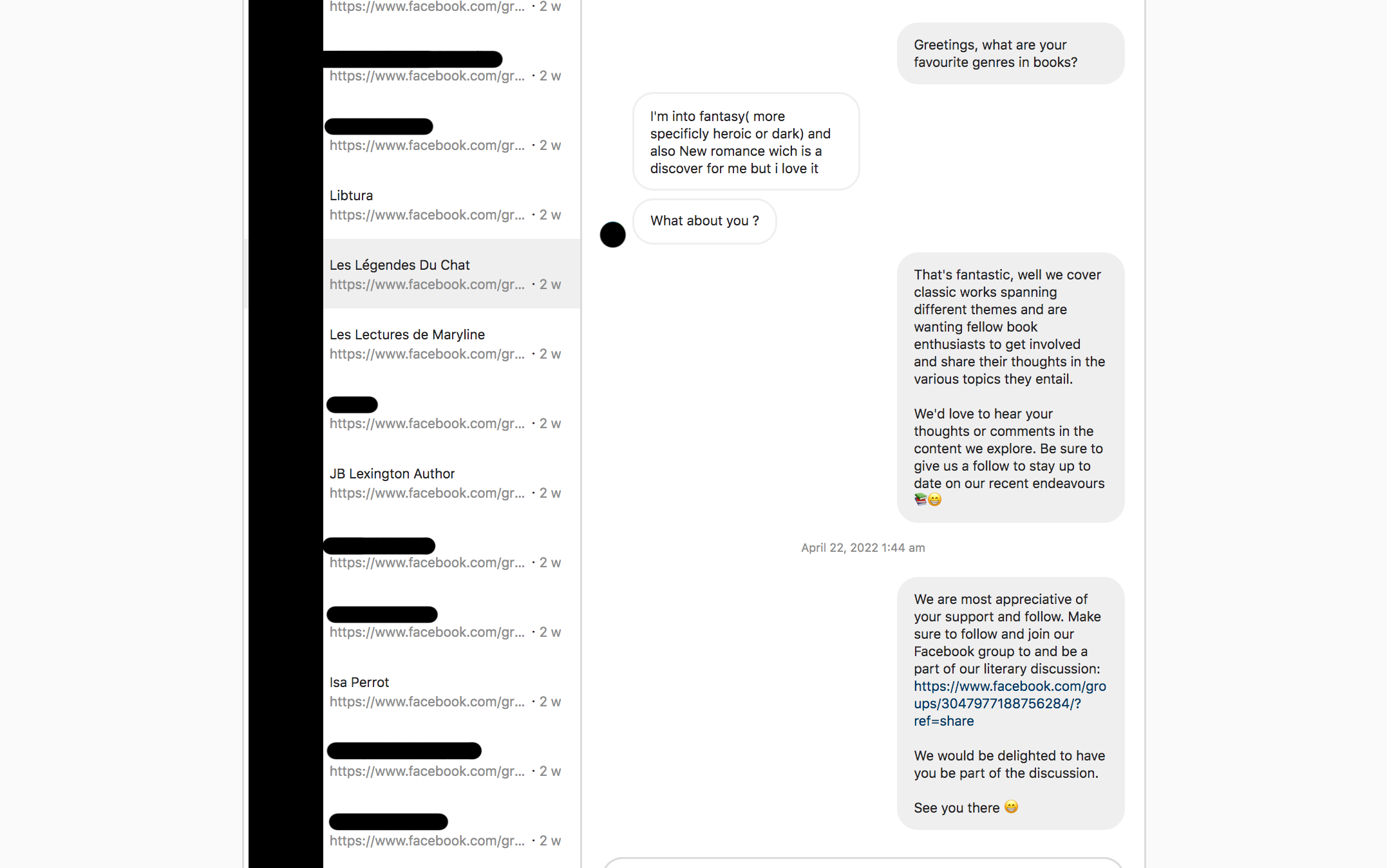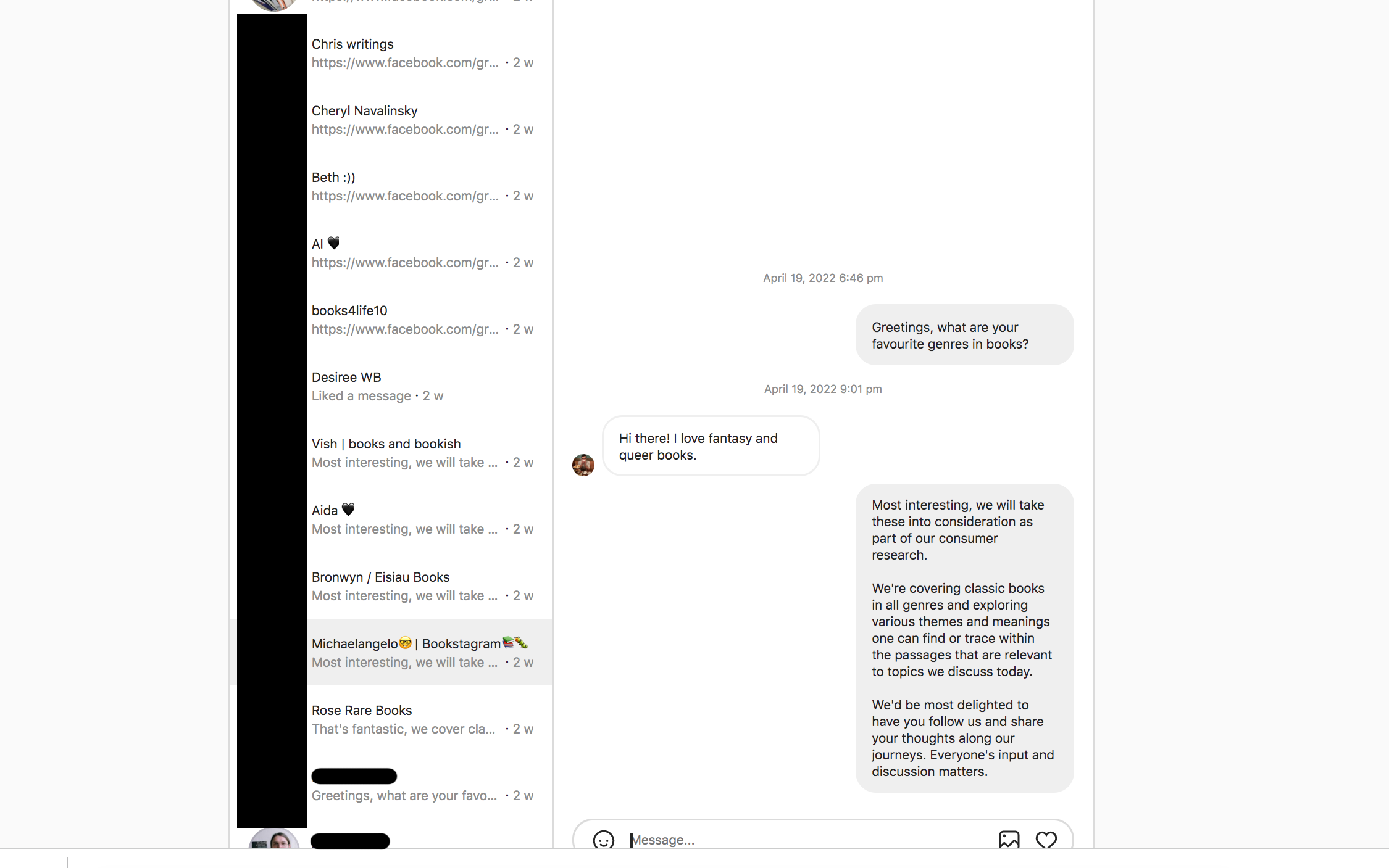 The group was further promoted through Instagram; I used the group link in place of the website as a means to inform our followers of how they can discover more of the brand and become further involved with our activity. In addition, networking helped in suggesting the group to users who became intrigued by our content, although sometimes occurrences would show that Facebook is not widely used as one may assume, such as these messages below (Figure 47).