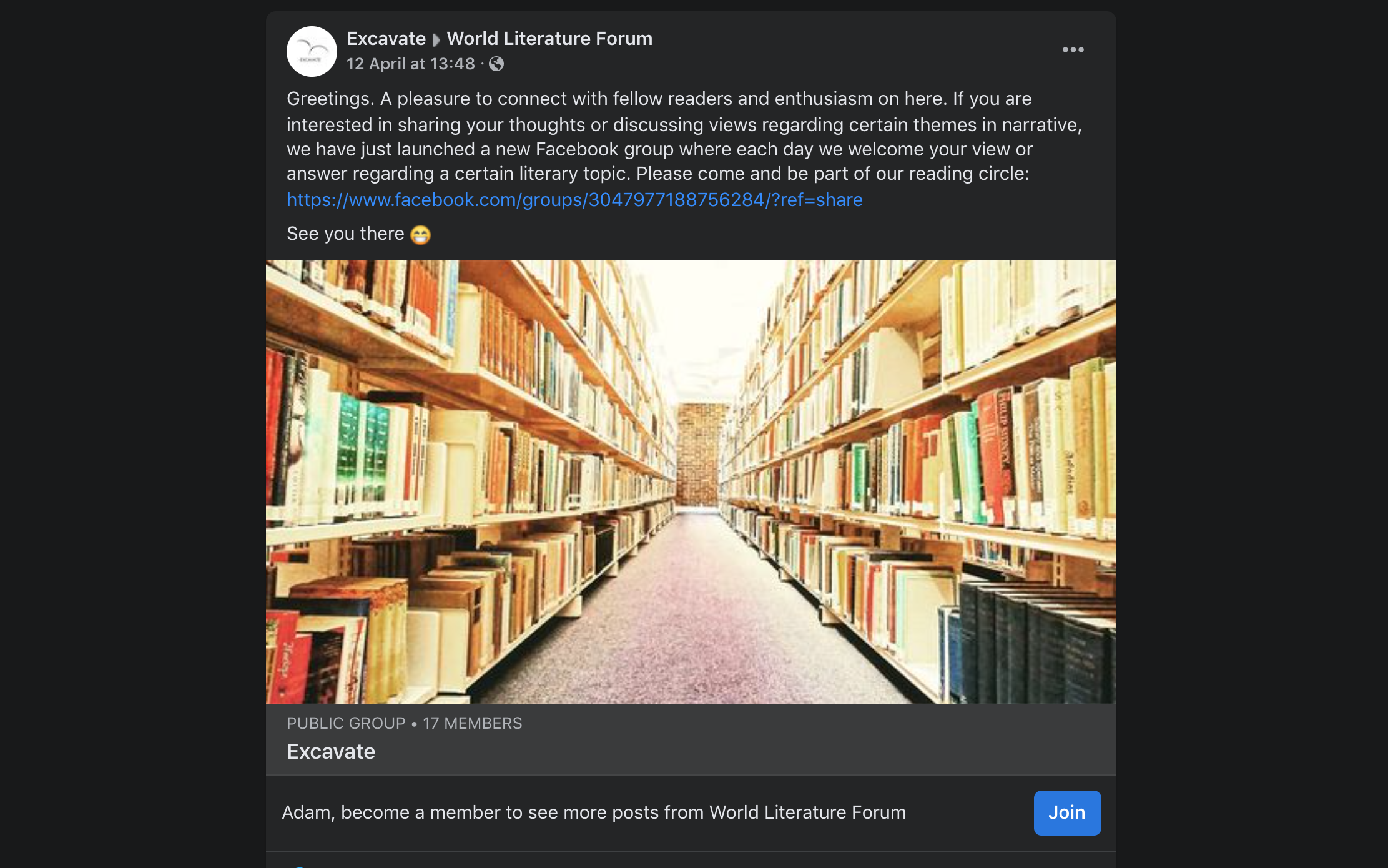 I operated the group a page profile which I called Excavate and shared the group through fellow literary blogs (Figure 46) as well as inviting personal contacts who had literary passion, the group generated roughly a dozen reaches for most posts.