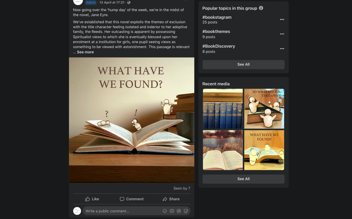 Concerning Facebook, I posted most of the same content from Instagram, but since it was a discussion-focused platform, the posts utilised more specific questions, such as the photo I posted about reading on the beach (Figure 45) in which more was asked regarding where people have spent their weekend reading. In addition, it was made as a public group in which anyone with reading intentions could share their thoughts or stories in book endeavours, something which Instagram lacked.