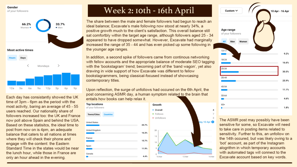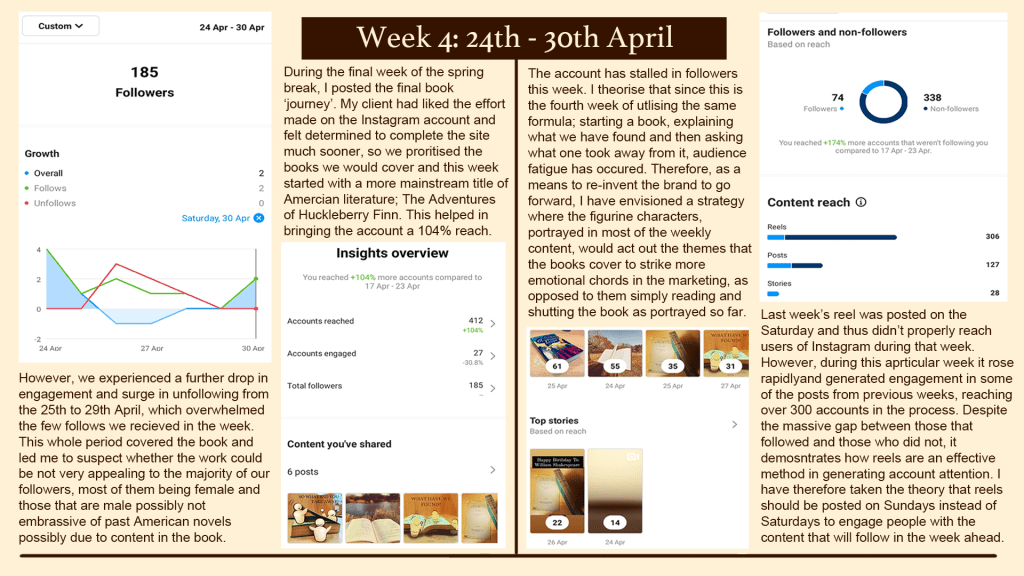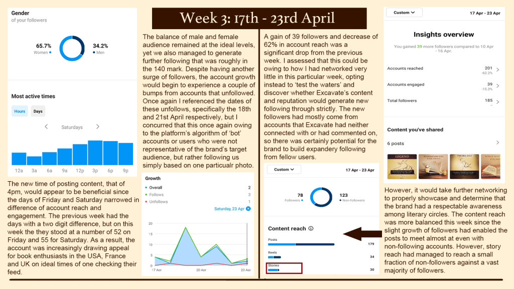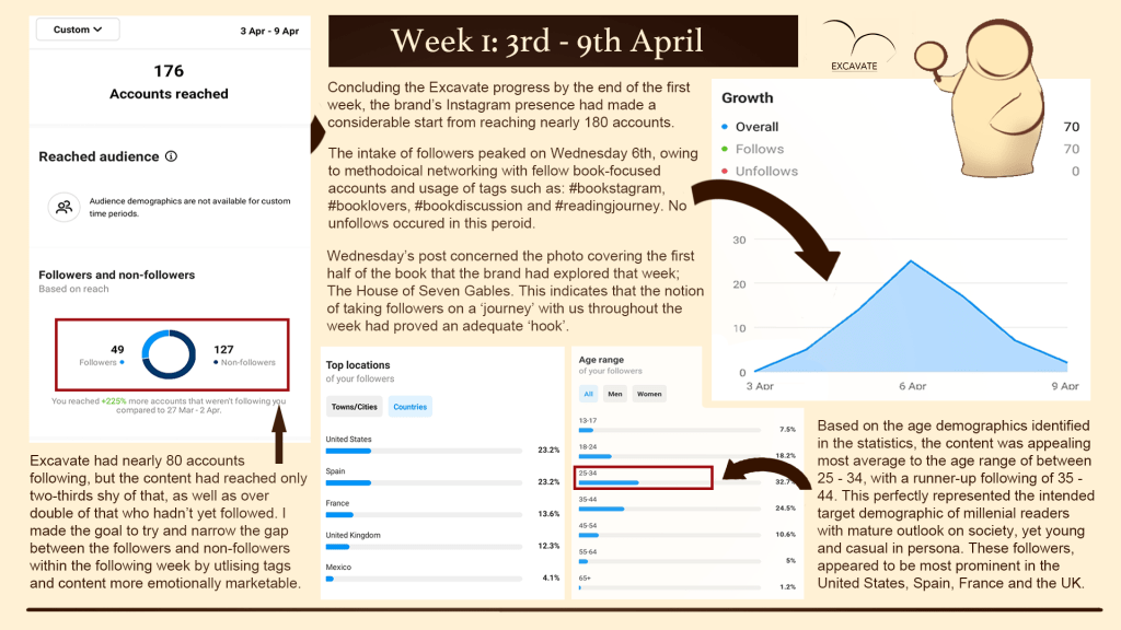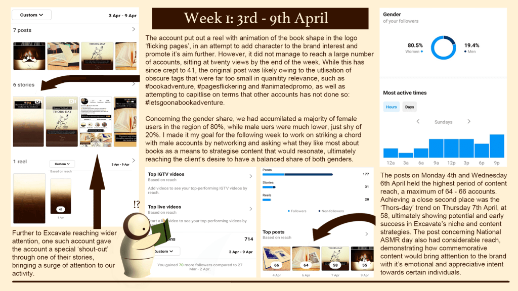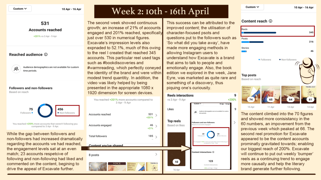 During the first week, followers peaked at a 25 intake between 5th – 7th April, when the ‘book of the week’ trend was in its midst covering the themes of the novel, The House of Seven Gables. This demonstrated how the weekly strategy proved popular with followers. Achieving a close second place in terms of views was the ‘Thors-day’ trend on 7th April, which stood at 52, ultimately showing potential and early success in Excavate’s reading-encouragement goal.
