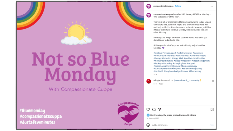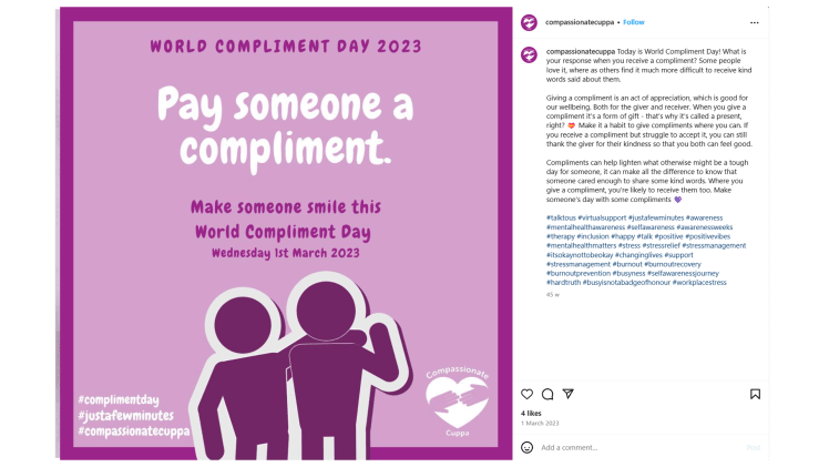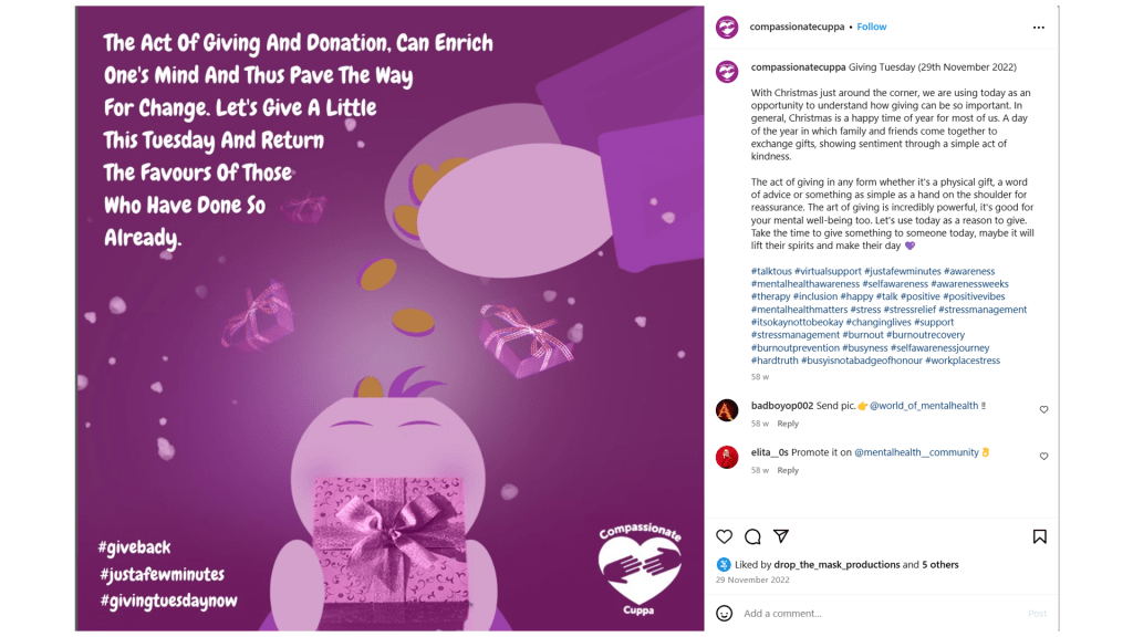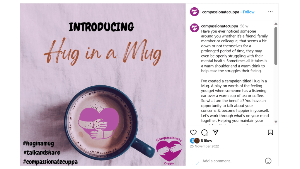 During my tenure with a marketing company, I played a pivotal role in promoting the brand Compassionate Cuppa, a mental-health support group aiming to provide assistance through online or in-person one-to-one interactions, complemented by a free beverage. My effective SEO strategy leveraged trending hashtags such as #justafewminutes and #talktous, emphasizing the power of simple communication and the gift of time in improving lives. In an era where such genuine connections are often lacking, especially in the realm of social media, these campaigns served as a poignant reminder of the positive impact a few minutes of conversation can have.